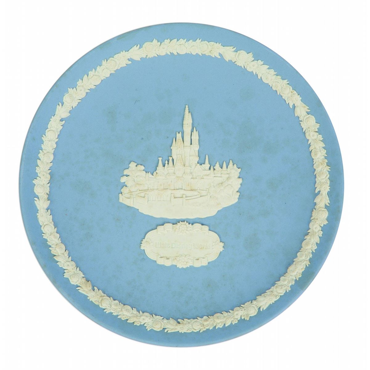 (Walt Disney World, 1976) A beautiful Wedgewood limited edition plate featuring relief artwork of Cinderella’s Castle within a highly decorative boarder. This plate is a first edition of 2000, and was an early Walt Disney World exclusive. Measures 6.5” in diameter. Comes with original box and information card. In good condition with very little wear. Has some faint orange staining to the front surface. Box has mild wear.