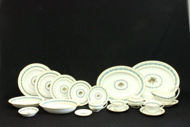 Including (12) dinner plates, (12) 9" plates, (12) 8 1/8" plates, (12) 6" plates, (12) 7" plates, (12) 5 1/4" bowls, (12) cups, (12) saucers, (8) bullion cups, (8) saucers, sugar dish, creamer, gravy bowl with attached underplate, (3) oval bowls, (2) oval platters, & (2) ashtrays. 122 pieces total.
