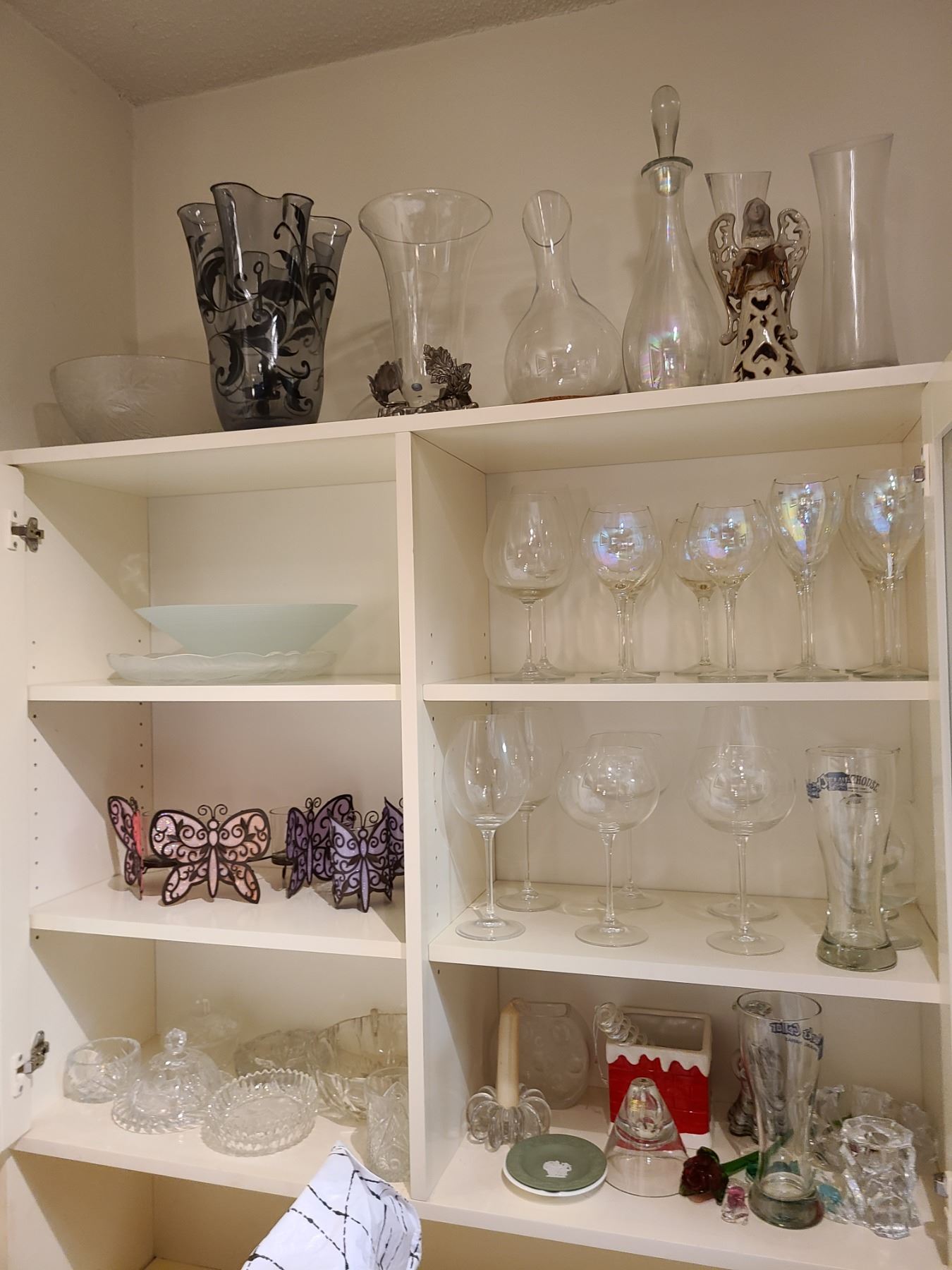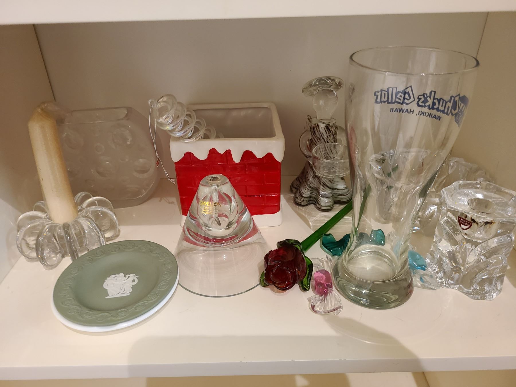 Lot includes assorted vases, largest 12 in., Wedgewood ashtrays, wine goblets, and candle holders. Bring packing material. Pickup in cat. B at 10 am.
