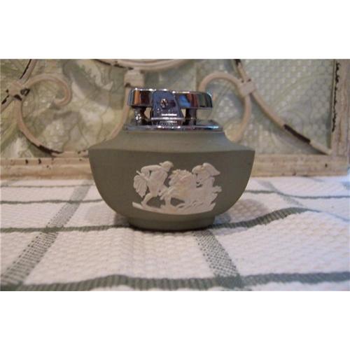 Here we have a 1940's era Table lighter by Ronson encased in Wedgewood Pottery. The sage green urn shape has nice deco lines on each side, and the classic attached wedgewood off white design. The silver tone Ronson lighter is in excellent condition. The finish is beautiful. Just needs fuel, The flint is there and sparks easily. Measures 2 3/4" tall by 3" long. The lighter is marked "Ronson", and the base is marked "Wedgewood" made in England. The condition is excellent, with no chips or problems.