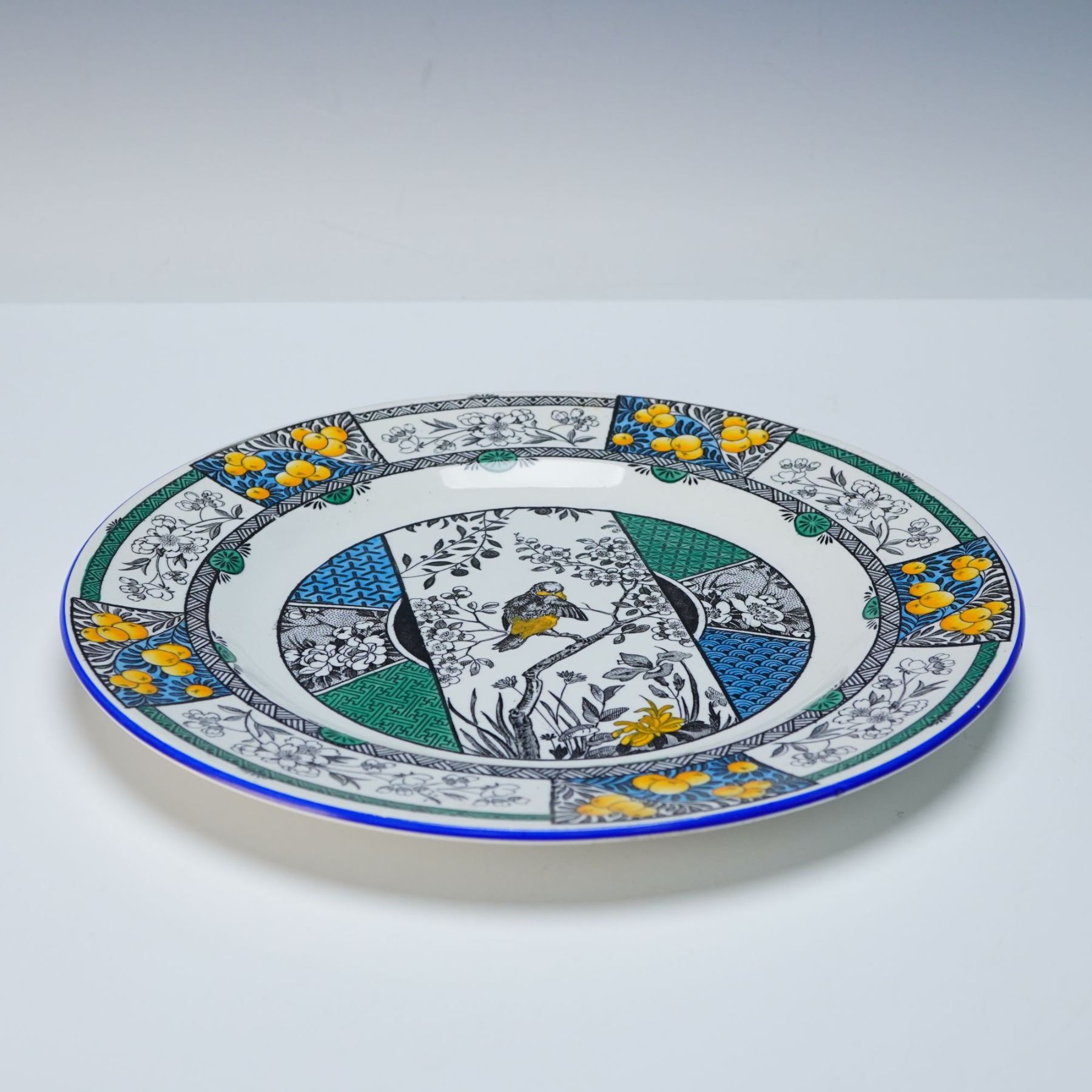 A Wedgwood Aesthetic Movement 'Panama' pattern ceramic plate. The plate features a multi-patterned design. The central circular motif depicts a bird perched on a flowering branch, rendered in black and white with yellow accents on the flowers and bird, framed by an octagonal border composed of four alternating geometric and monochrome foliage patterns in teal, green, and light blue. The wide rim is decorated with stylized floral and berry motifs in black, white, and yellow, bordered by a thin blue line along the outer edge. The reverse is marked with a black printed 'WEDGWOOD ETRURIA ENGLAND'.
