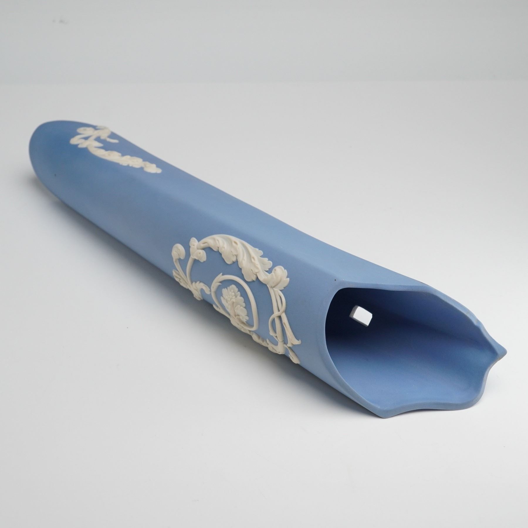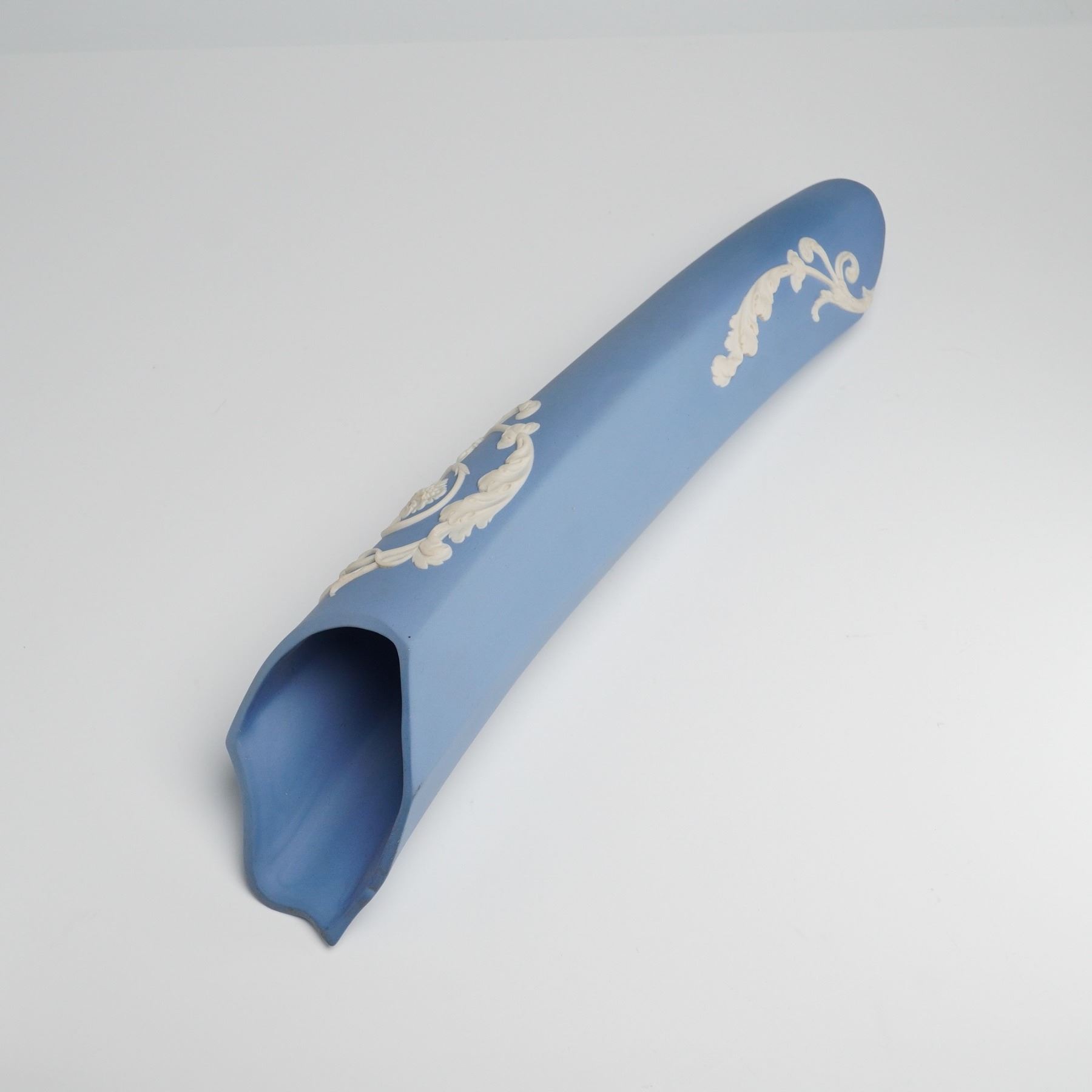 A Wedgwood light blue jasperware ceramic component, designed as a tapered handle for a large vessel or teapot. The piece features a curved form with a flared open end and a small square aperture on one side intended for a mounting pin. The exterior is decorated with white bas-relief sprigged ornamentation in the neo-classical style, consisting of foliate scrolls and floral medallions. The item is finished with a characteristic matte surface. The rounded terminal is impressed with several factory marks.