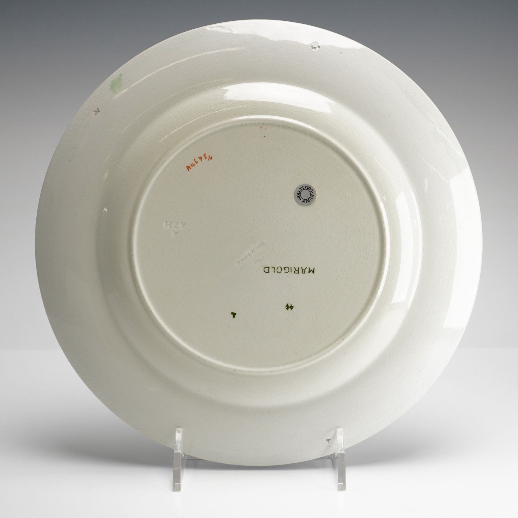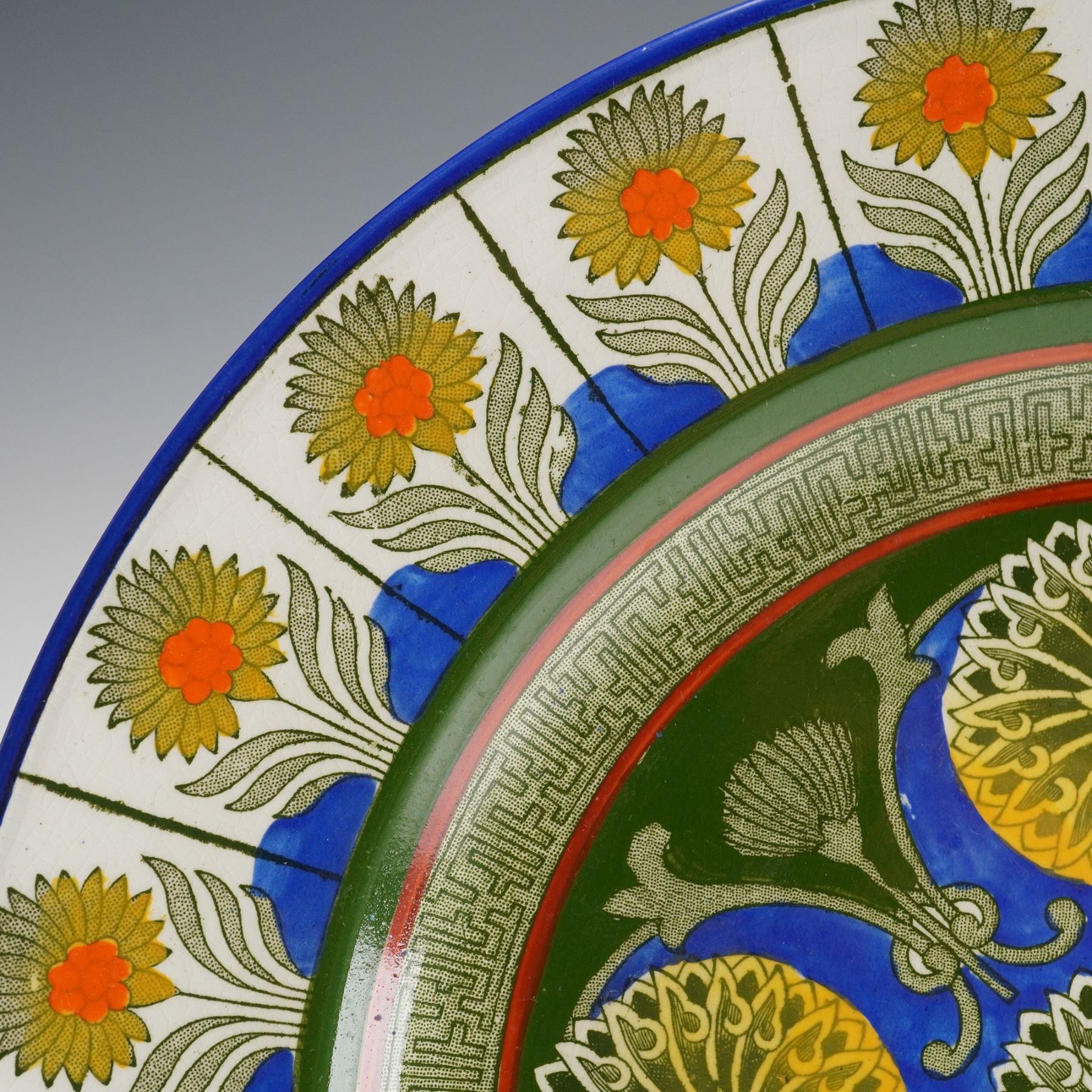 The decoration is executed in polychrome enamel over a transfer-printed base. The design features bold colors, predominantly green, blue, yellow, and orange, executing complex geometric and stylized marigolds motifs arranged in concentric bands. The center well is a dark green ground bordered by a red geometric fret or Greek key pattern. The reverse features the Wedgwood impressed stamp, and provenance sticker for the Rubin Collection.