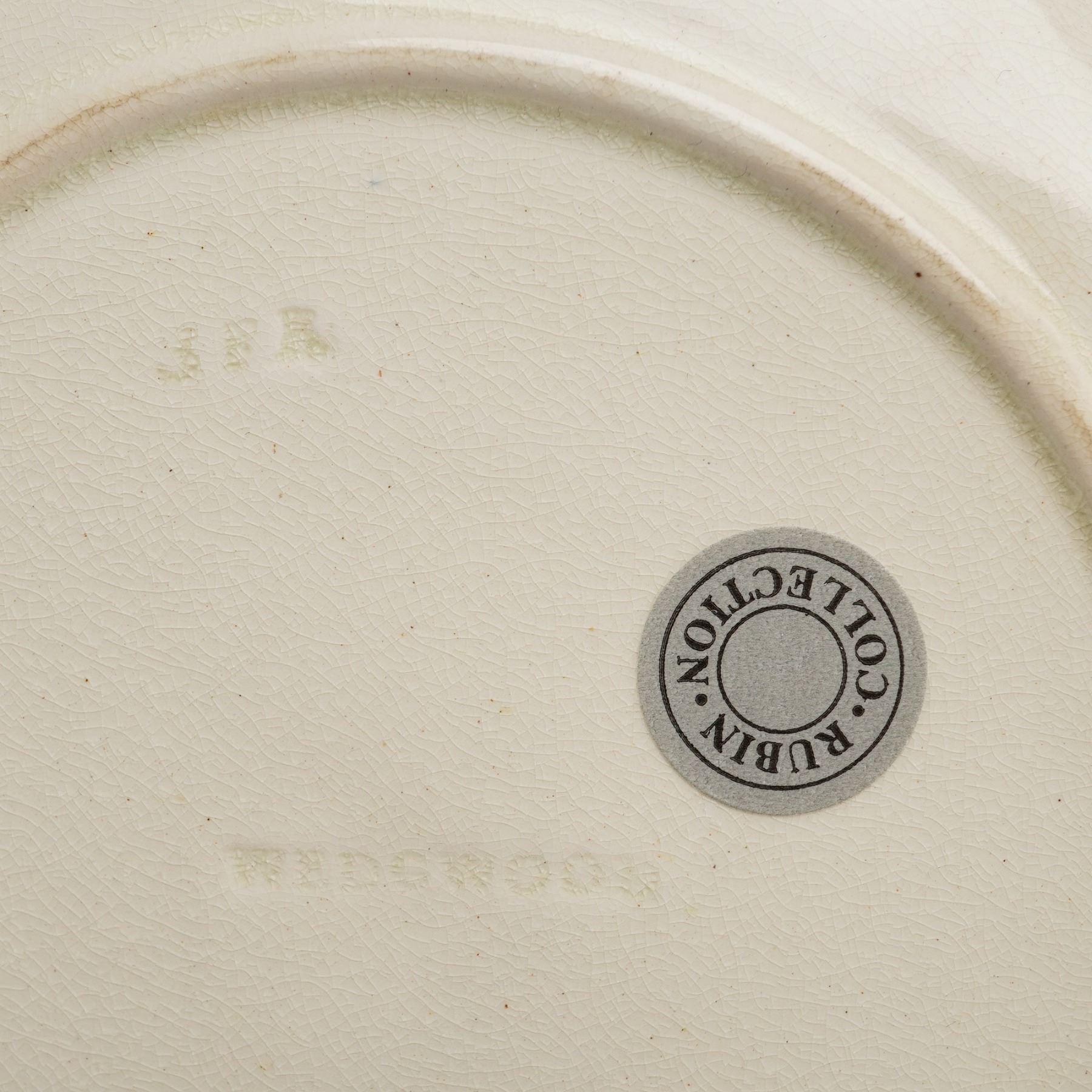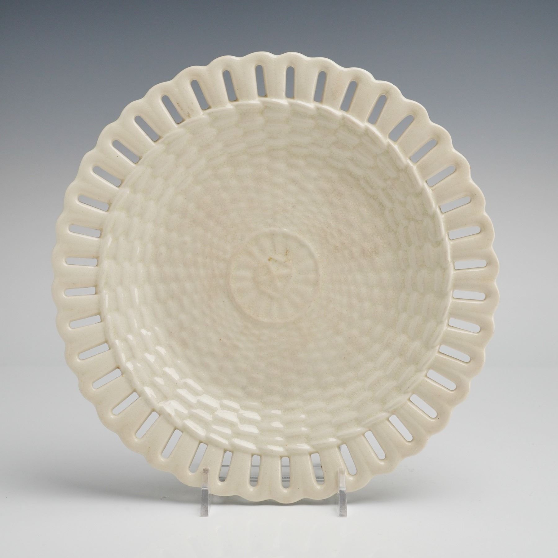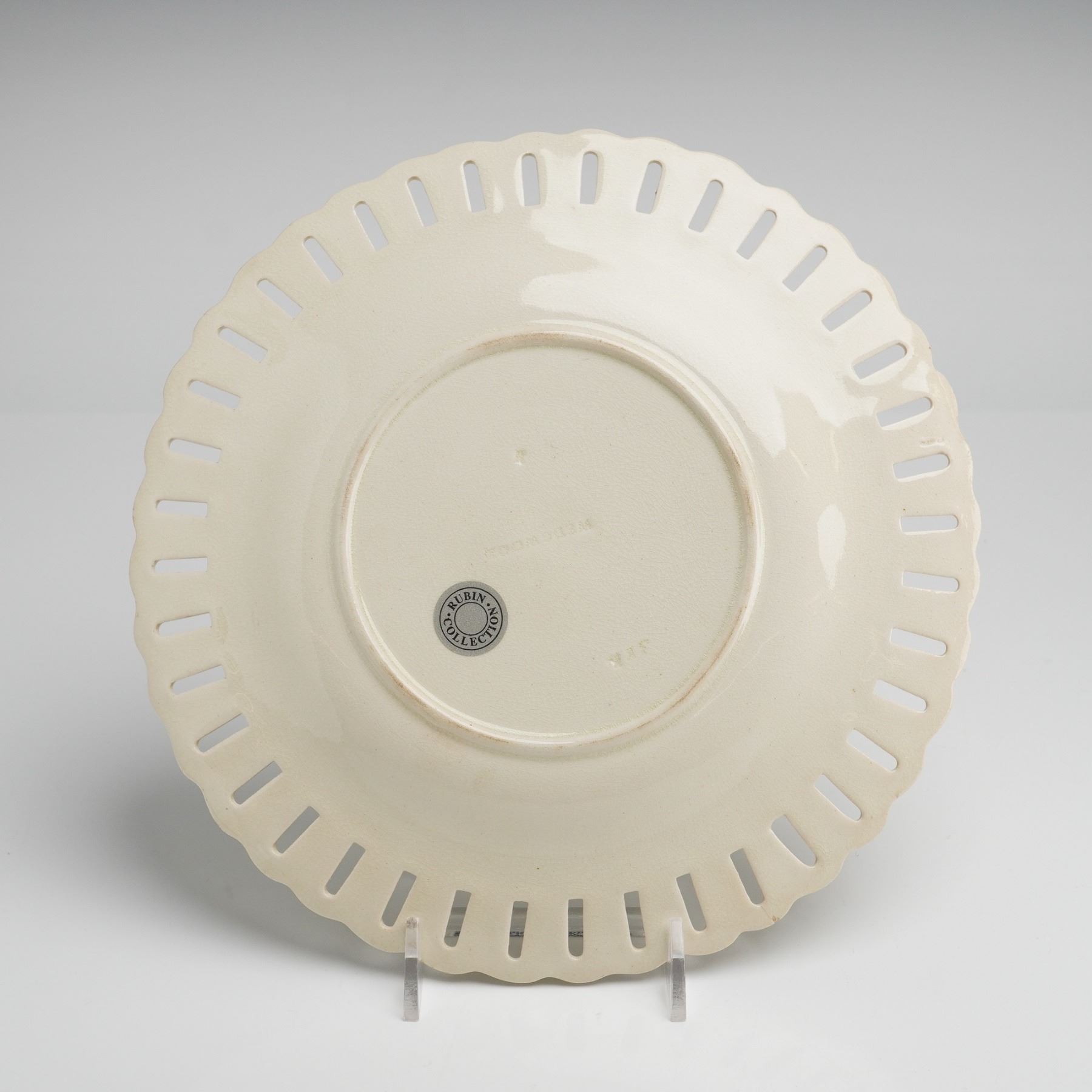 A 19th-century Wedgwood creamware plate, also known as Queensware, featuring a molded basketweave textured center. The wide reticulated border is designed with vertical pierced slits and a scalloped rim. The reverse of the plate is impressed with the WEDGWOOD manufacturer mark and a three-letter date code. A circular sticker for the Rubin Collection is present on the underside.