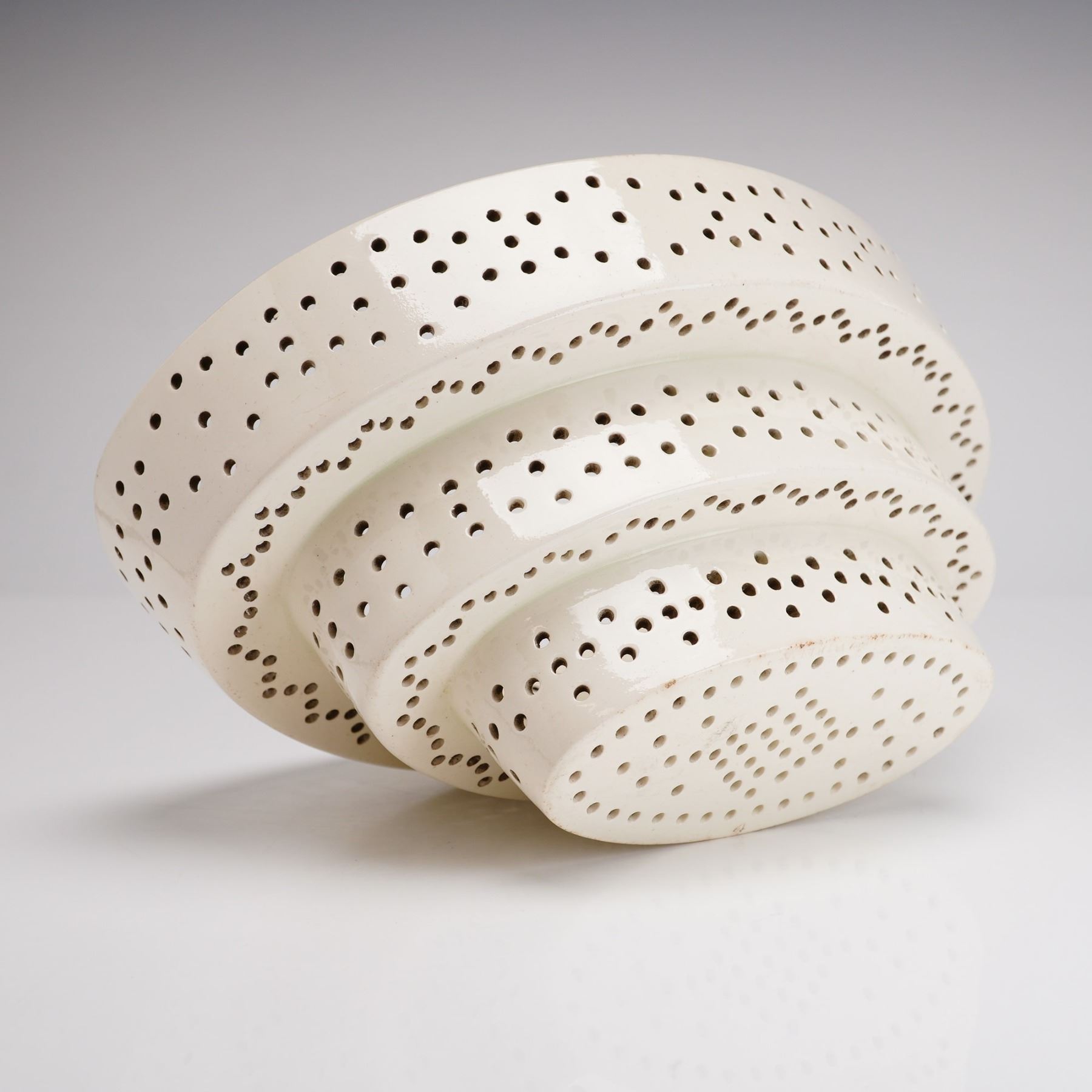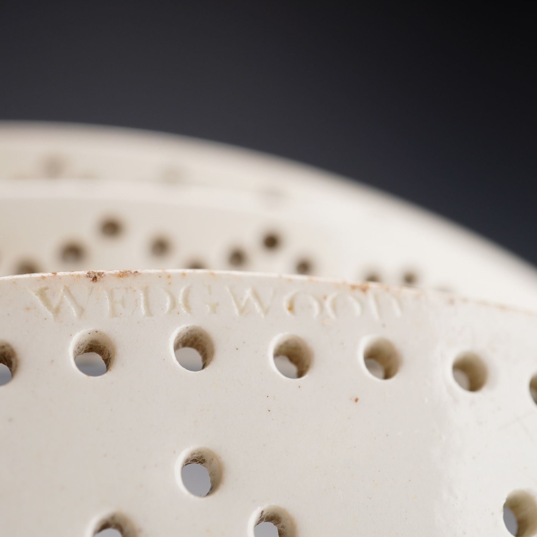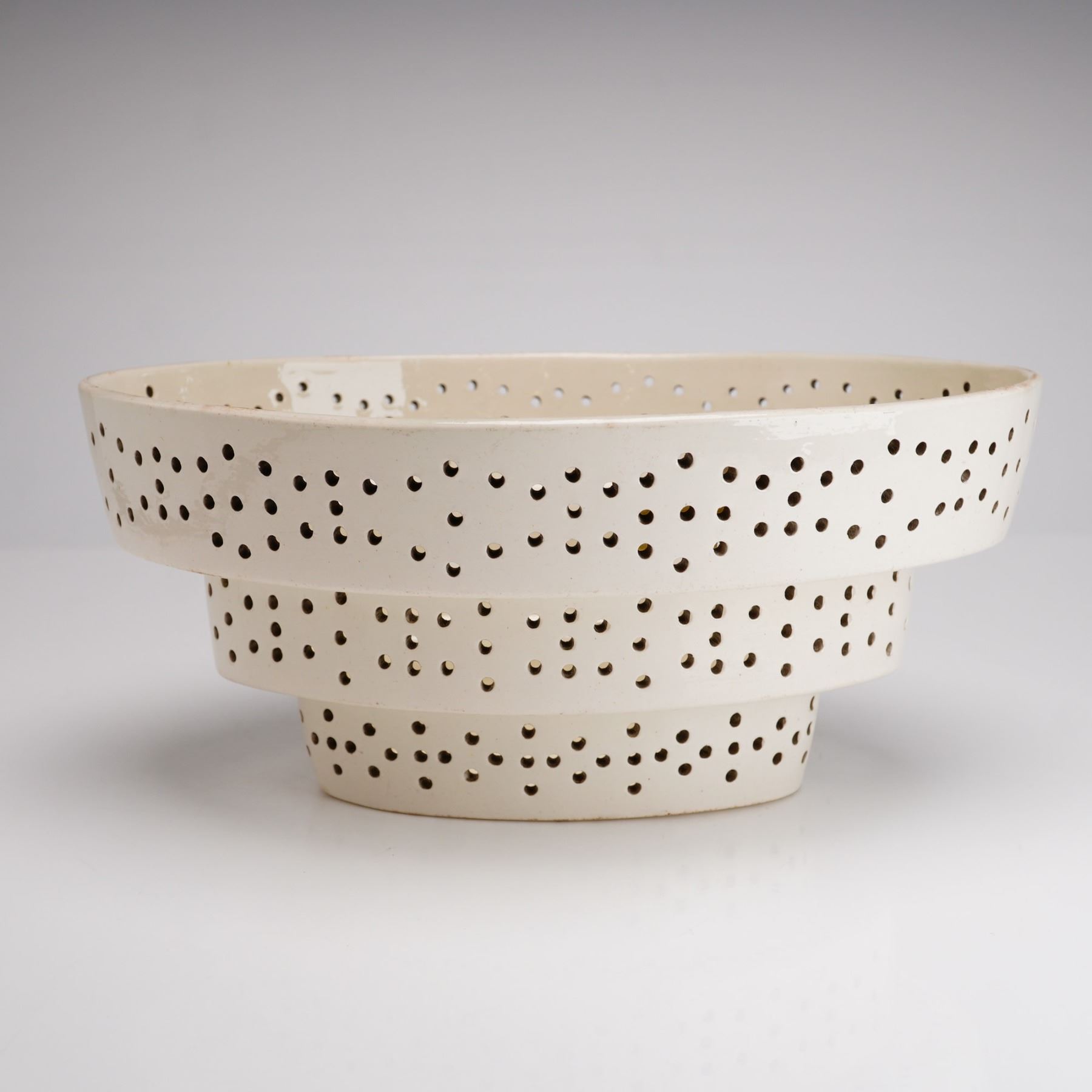 A fine Wedgwood creamware (earthenware) curd cheese mold, dating to the late 18th or early 19th century. The piece features a distinctive three-tiered, stepped circular form with a flat base. The entire body, including the tiers and the bottom, is decoratively perforated with a pattern of small, circular pierced holes designed for drainage. It is finished in a plain, cream-colored lead glaze typical of early creamware, where the primary aesthetic interest is derived from the architectural form and the precise piercing. The piece bears an impressed WEDGWOOD mark located on the interior ledge of the middle tier. Dimensions: Not provided.