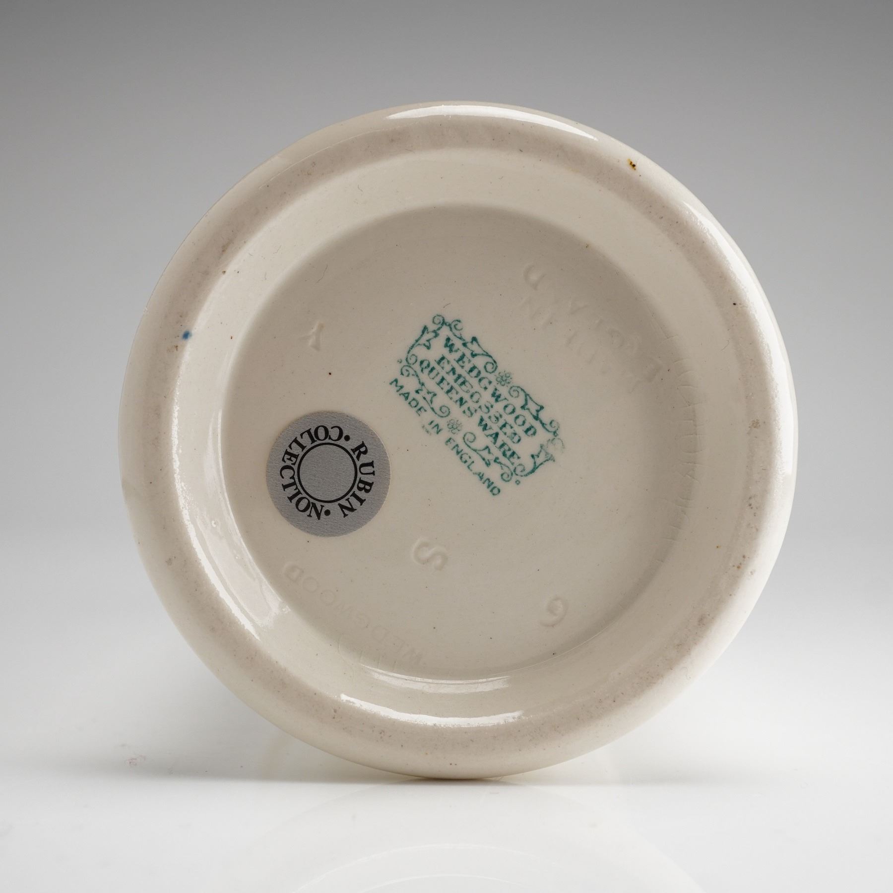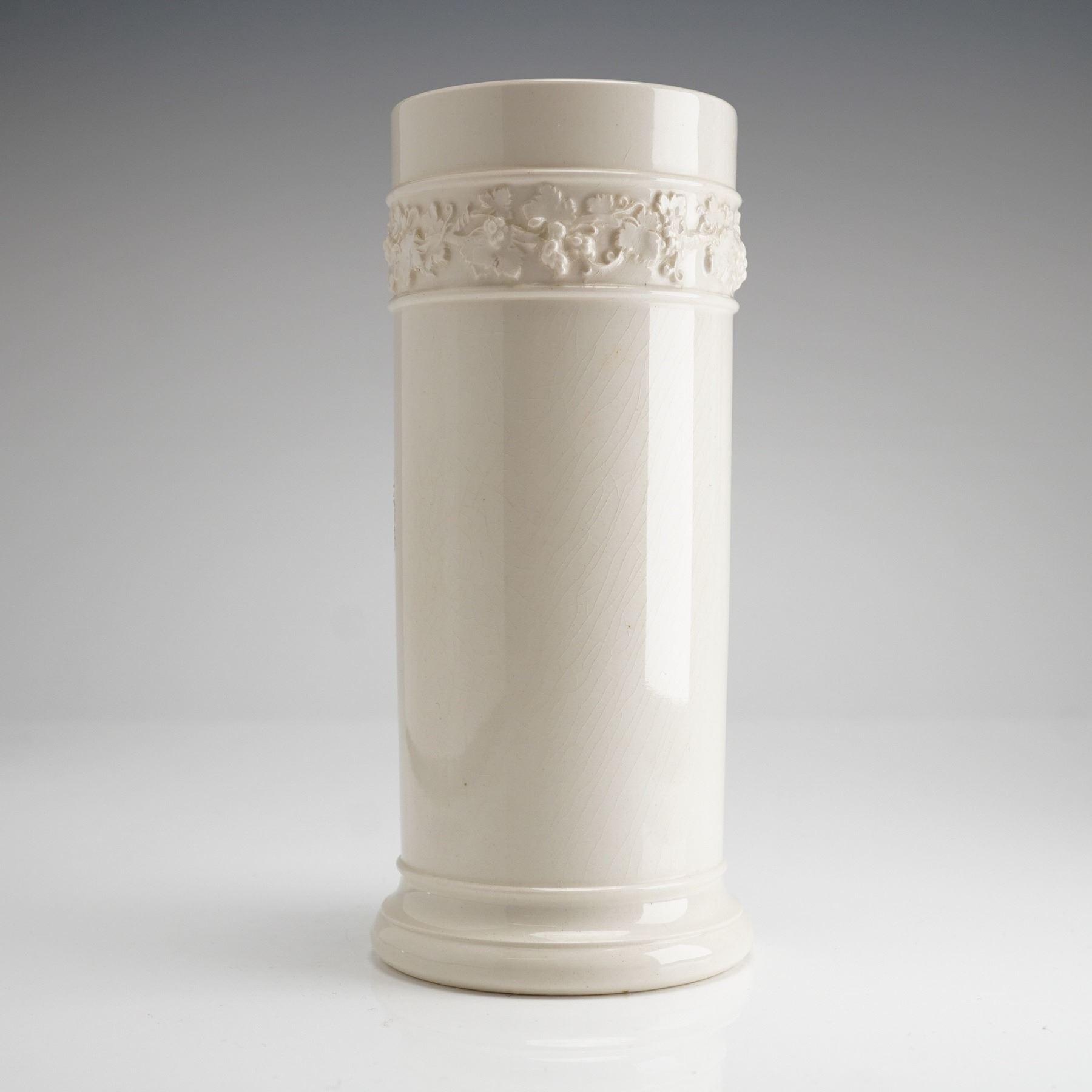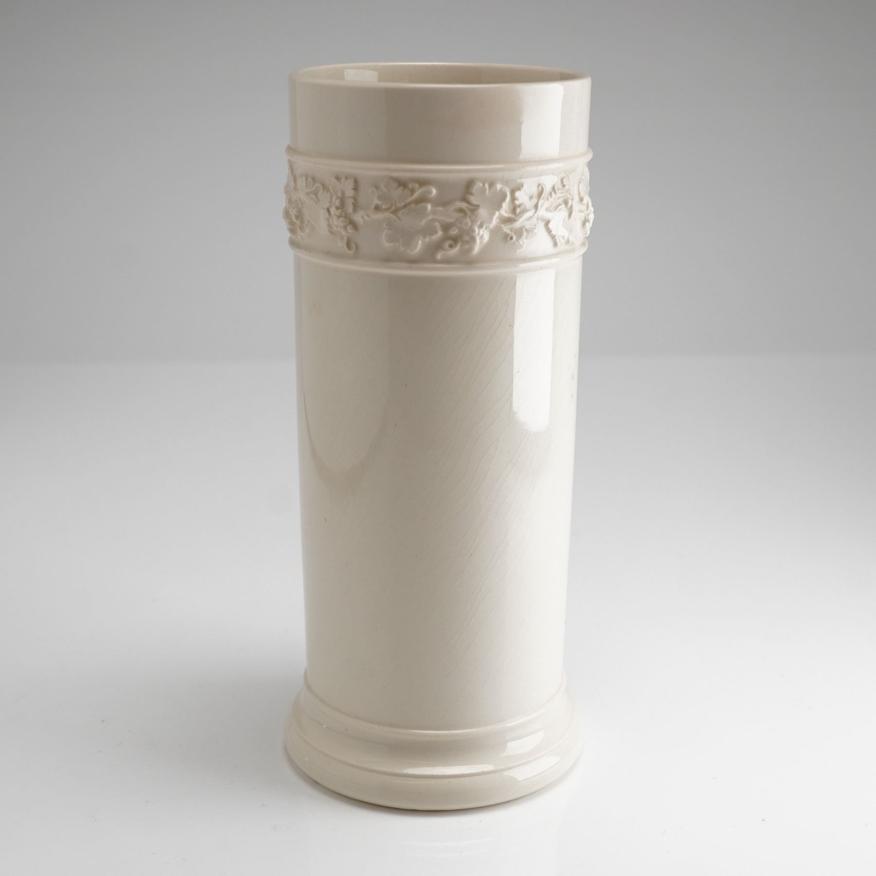 A single cylindrical ceramic vessel executed in Wedgwood Queensware. The vase features a cream-colored glossy glaze throughout, often referred to as Cream on Cream or White on White. The body is plain and cylindrical, rising from a molded, slightly flared base. The upper section of the vase is decorated with a broad band of high-relief molded foliate and vine scroll decoration, consistent with the Grapevine pattern. The base of the vessel bears impressed markings, including Wedgwood Embossed Queens Ware. Provenance sticker from the Ellis Rubin Collection.