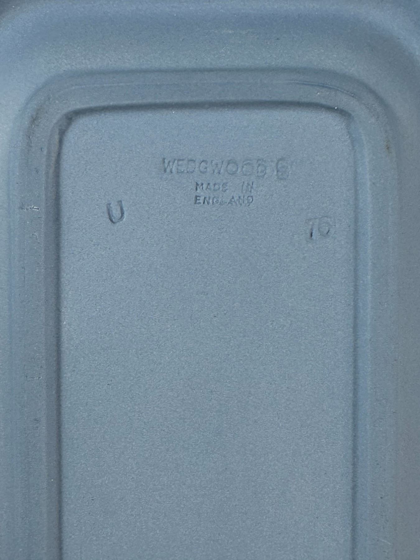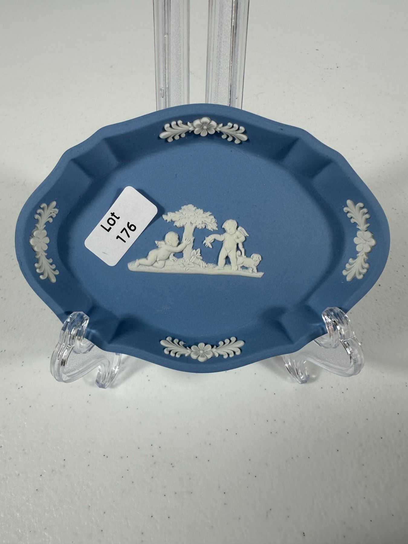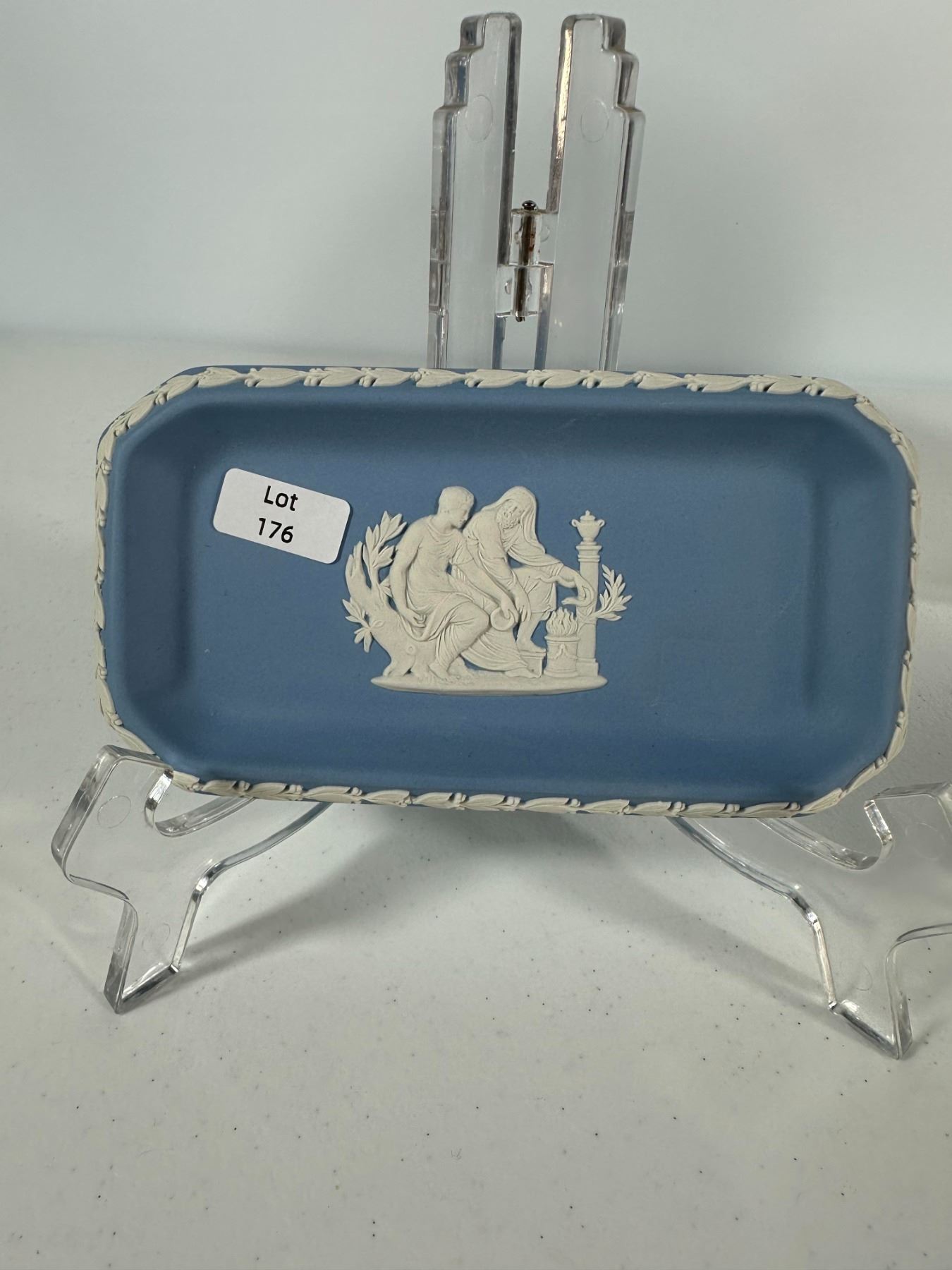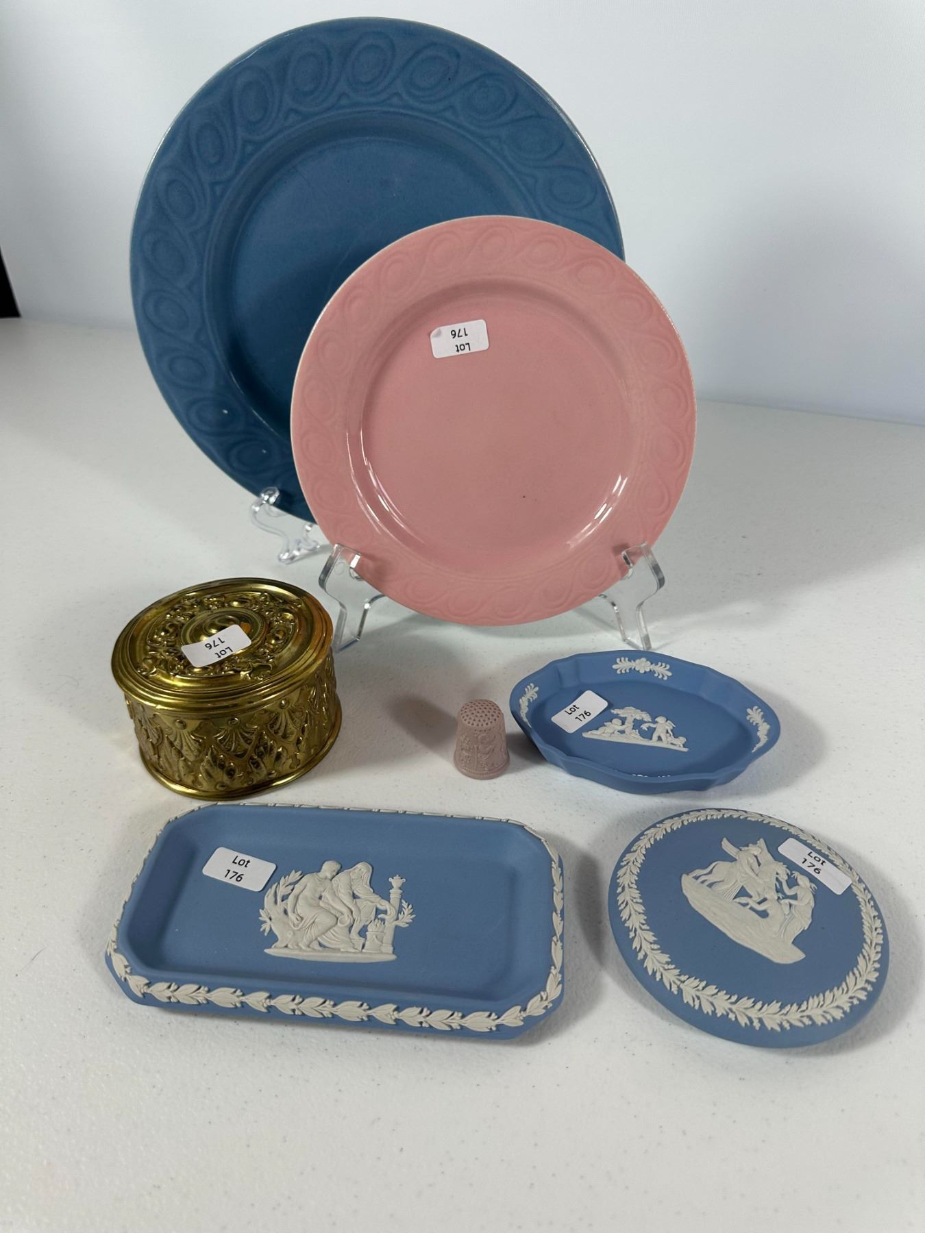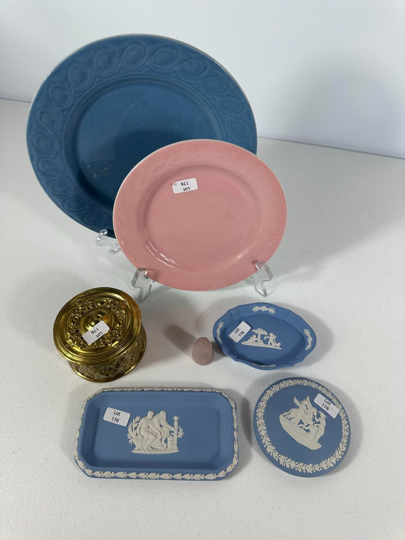 Mixed lot including three classic blue Wedgwood Jasperware trays with white relief, a pair of Medalta pottery plates in pink and blue, a small ornate metal trinket box, and a vintage sewing thimble.