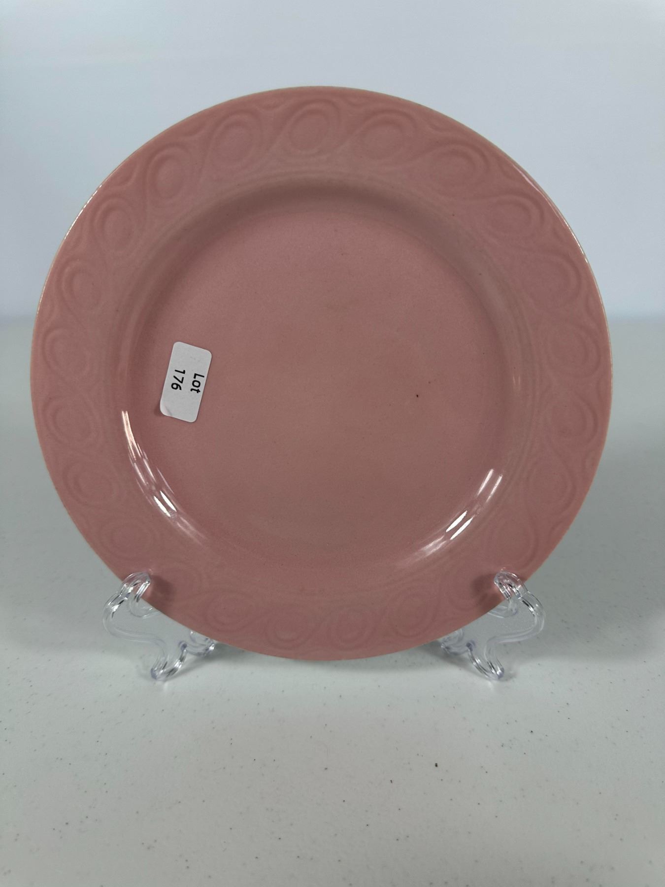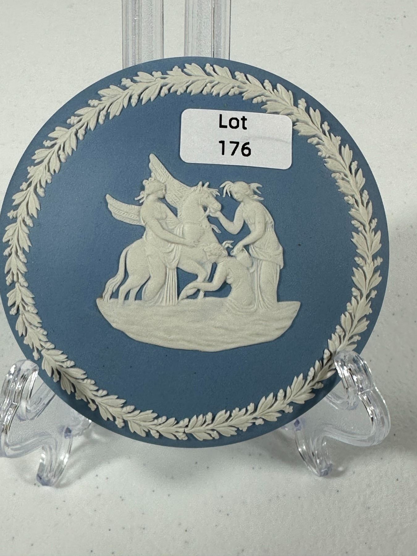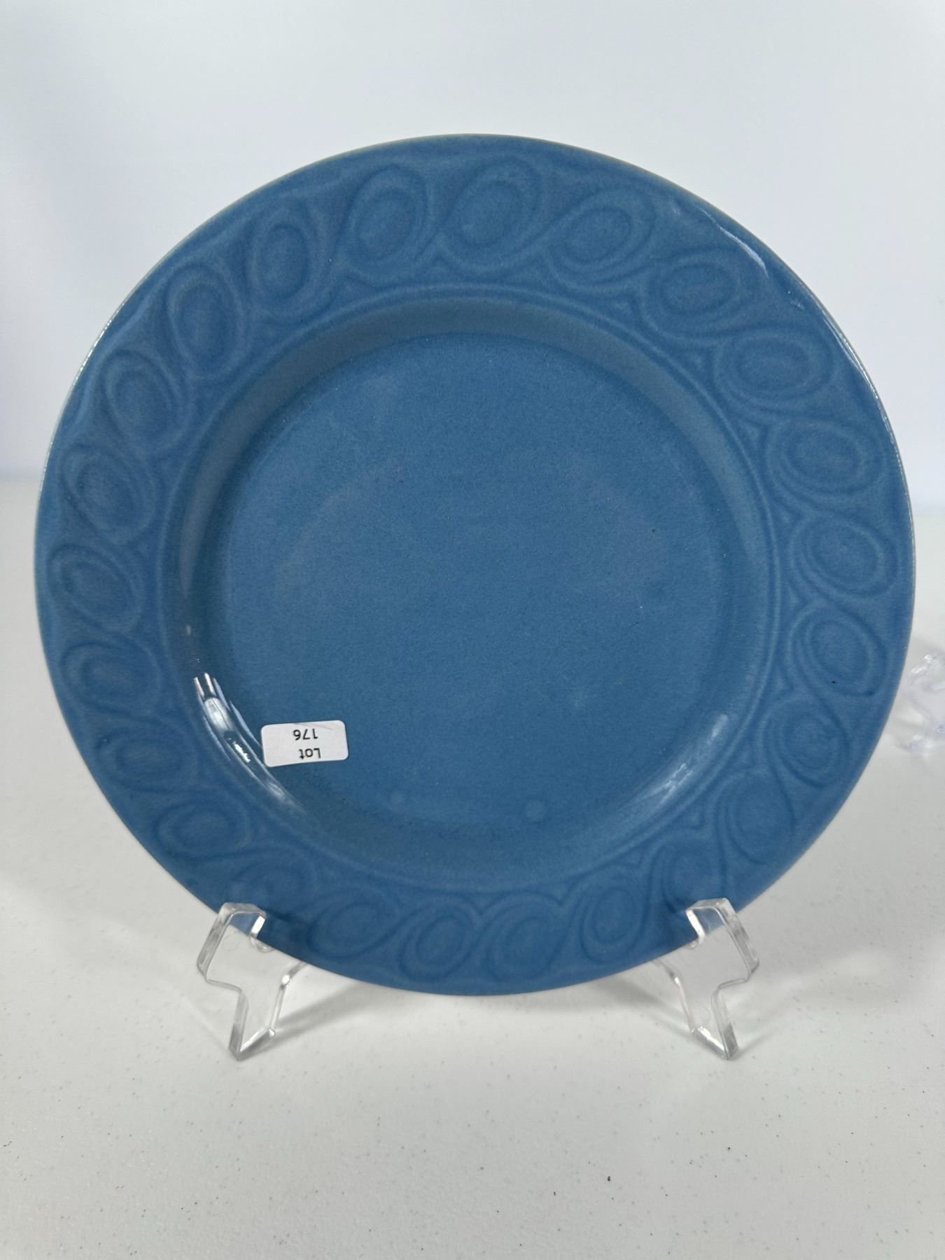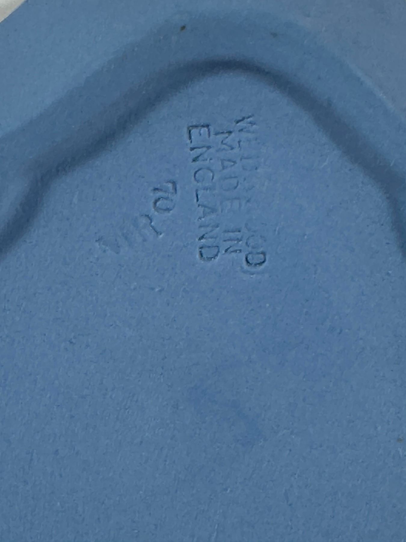 Mixed lot including three classic blue Wedgwood Jasperware trays with white relief, a pair of Medalta pottery plates in pink and blue, a small ornate metal trinket box, and a vintage sewing thimble.