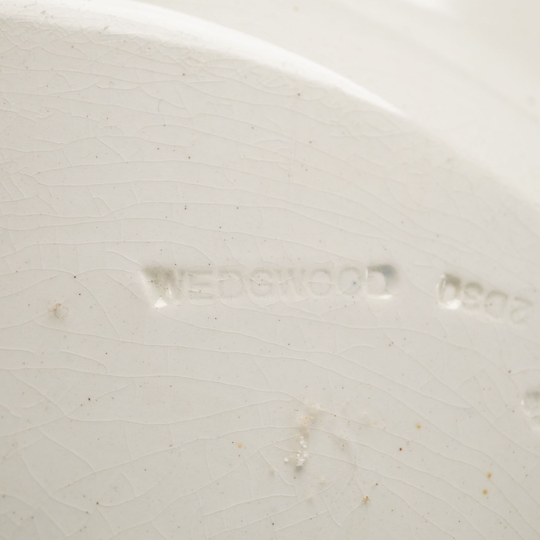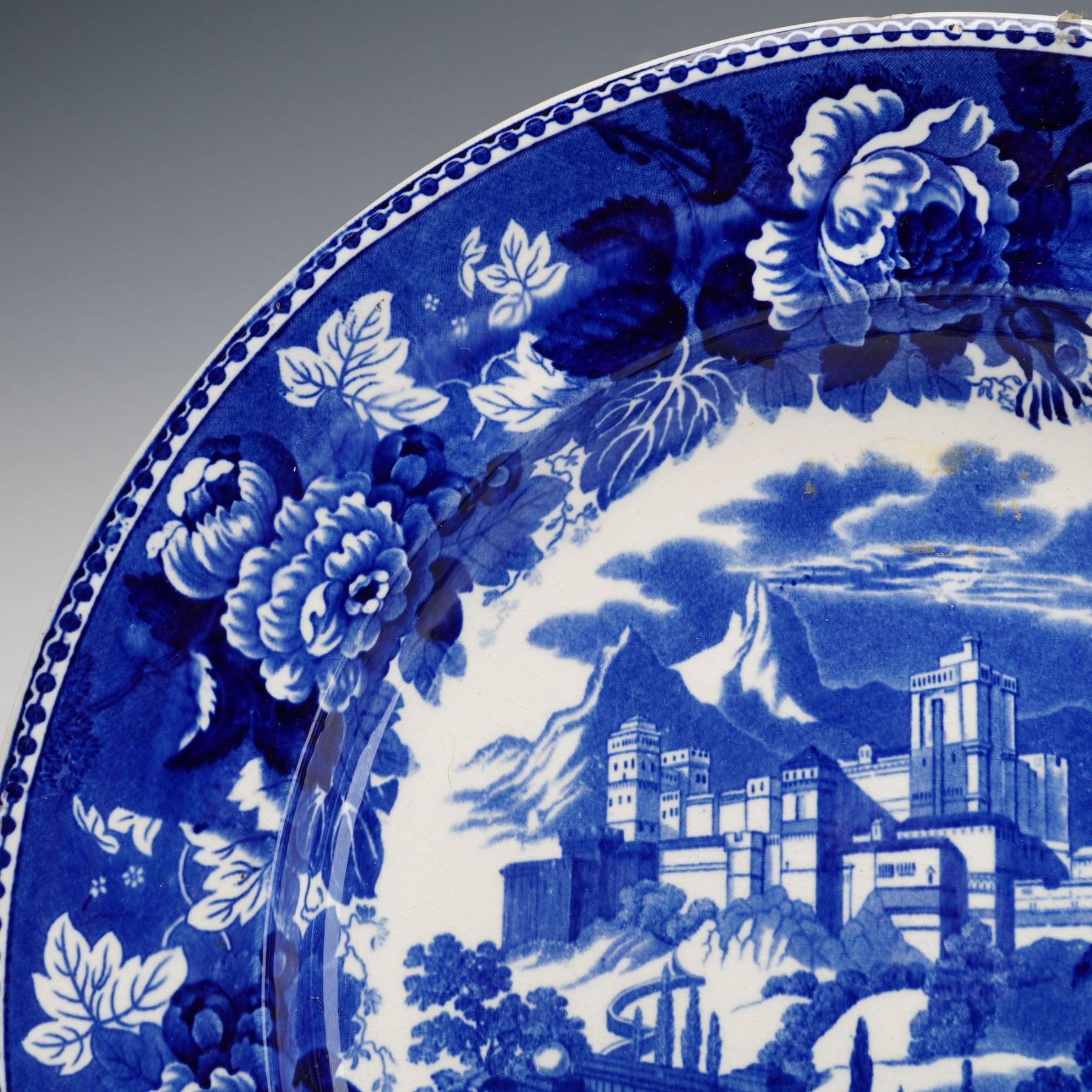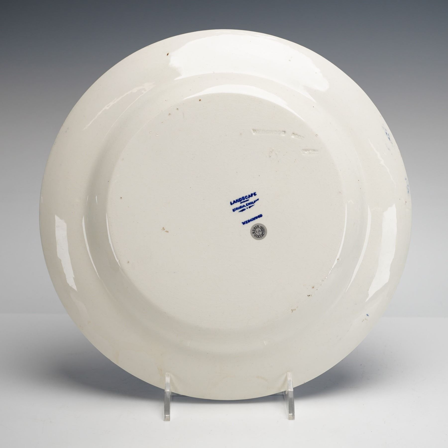 This refined Wedgwood transferware plate showcases a captivating and deep blue landscape scene, centered by a pastoral composition of a figure resting against a bull in the foreground. The midground features an elegant bridge that leads the eye toward a sprawling, distant city nestled among a dramatic mountain range. The central scene is framed by an expansive and intricate floral border, a signature element of the celebrated "Landscape" series. On the reverse, the plate is clearly marked with the "Landscape" pattern name alongside the "Etruria England" and "Wedgwood" stamps, and it bears a prestigious Rubin Collection sticker.