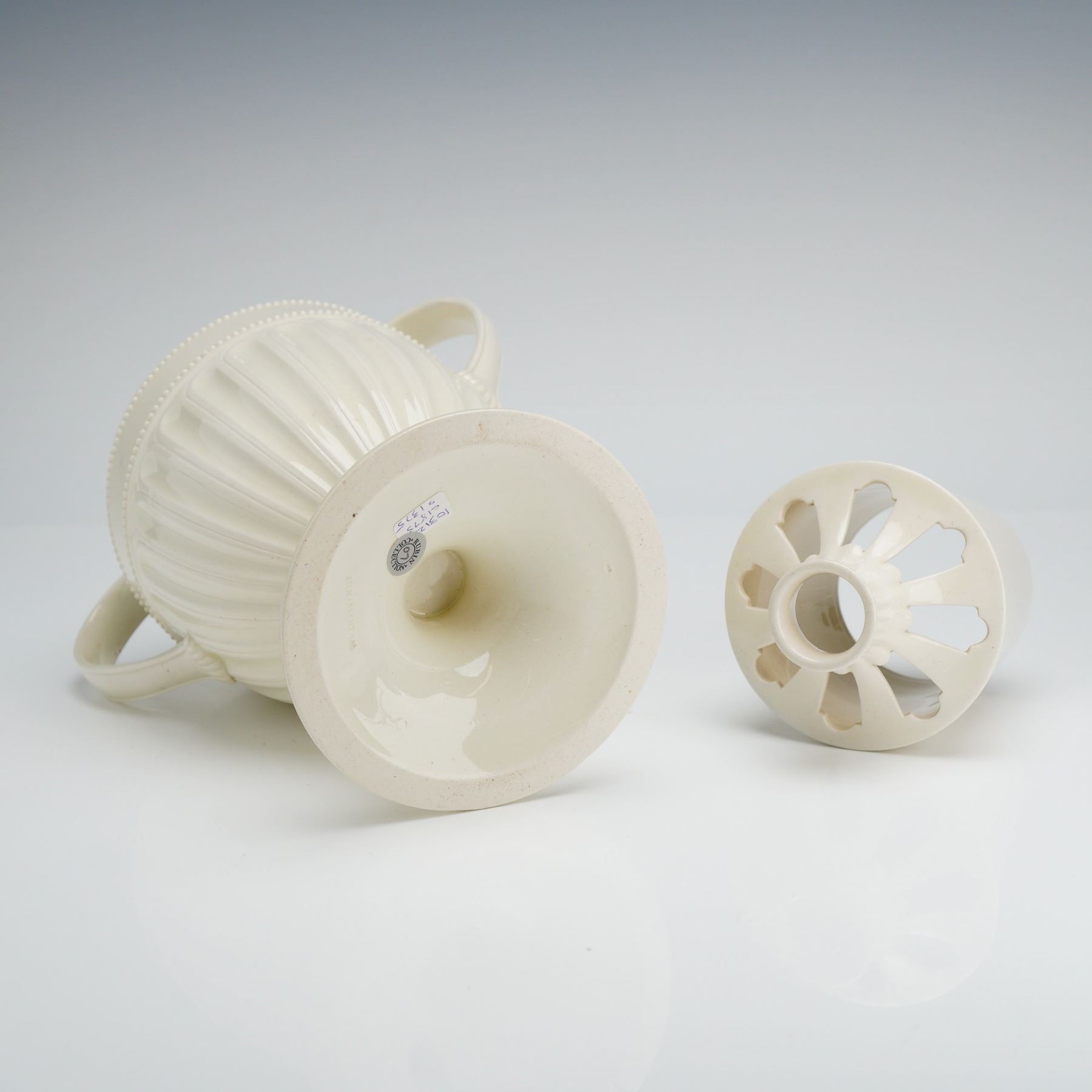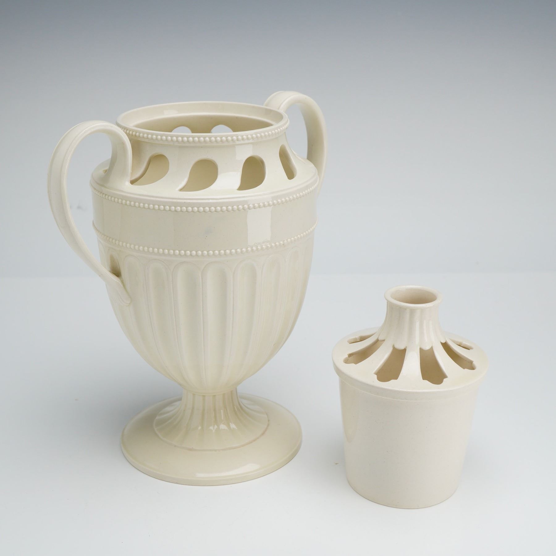 A fine Wedgwood creamware potpourri urn and flower frog insert designed in the Neoclassical taste. This two-piece set is crafted from cream-colored glazed earthenware, featuring a twin-handled urn supported by a fluted pedestal foot. The vessel is decorated with molded vertical fluting and horizontal bands of beaded ornamentation, with the shoulder featuring a series of teardrop-shaped reticulated piercings. The set includes a removable tapered insert with a flared top and radiating pierced apertures, intended for the arrangement of flower stems or the diffusion of potpourri. The underside of the base retains Wedgwood impressed mark and a circular sticker printed with RUBIN COLLECTION.