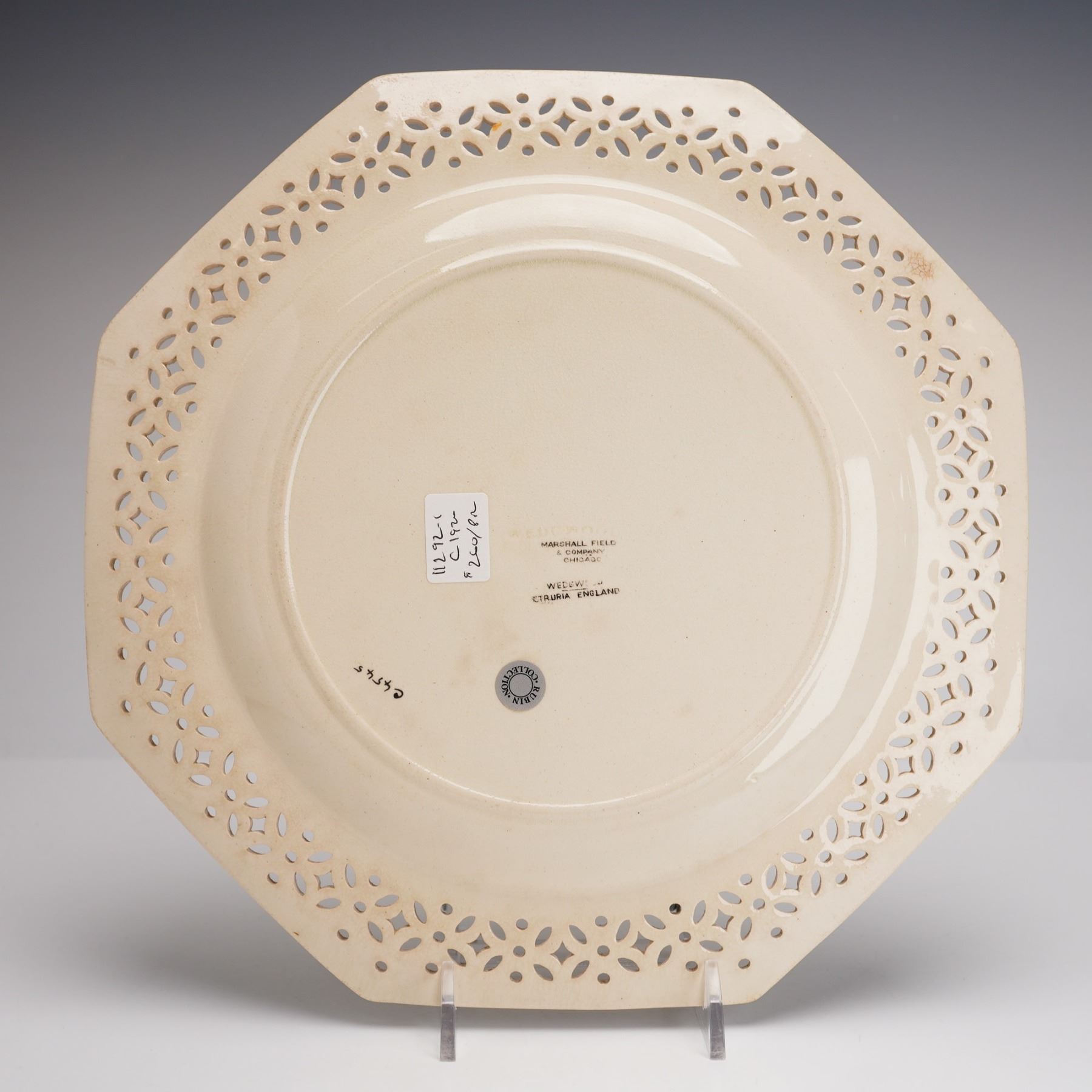Manufactured by Wedgwood in their signature Queen's Ware creamware, this octagonal plate features an intricate reticulated border with a geometric and floral motif and a molded beaded rim. The center is decorated with an inset black basalt medallion featuring a sprigged bas-relief of a neoclassical mythological scene with a draped woman and child. The reverse is marked with a printed black WEDGWOOD ETRURIA ENGLAND stamp, an impressed WEDGWOOD mark, and a retailer stamp for MARSHALL FIELD & COMPANY CHICAGO. The base also includes a RUBIN COLLECTION sticker and handwritten inventory numbers. Dimensions: 9.5 inches.