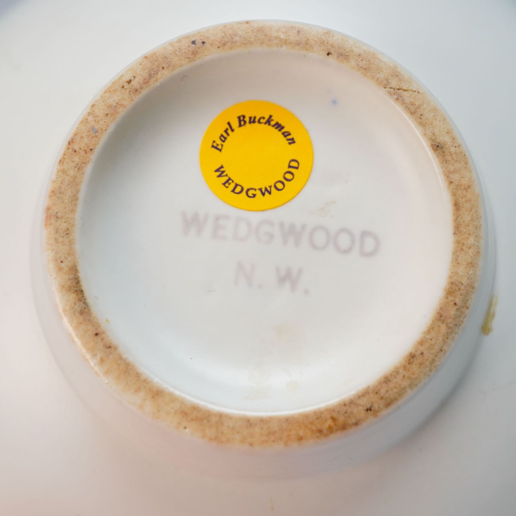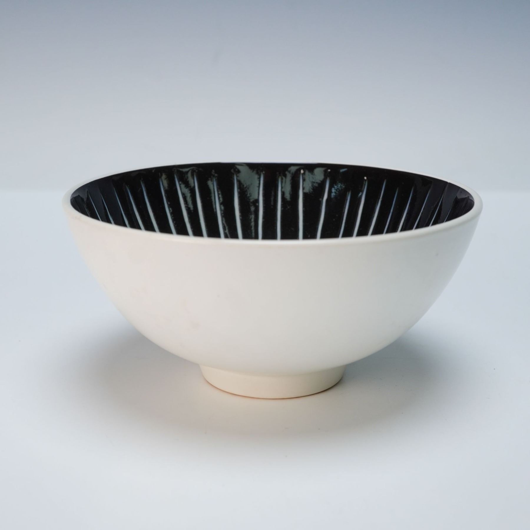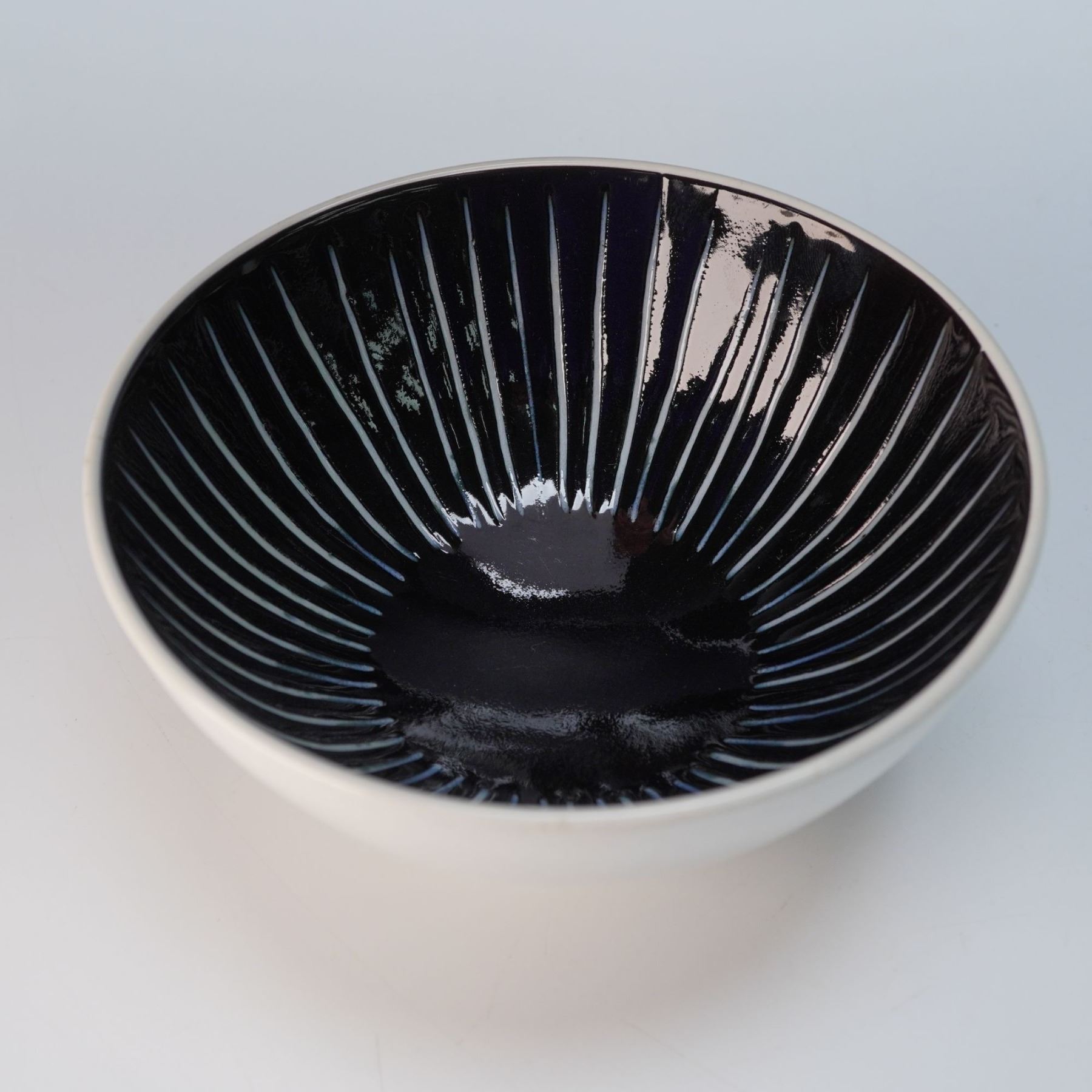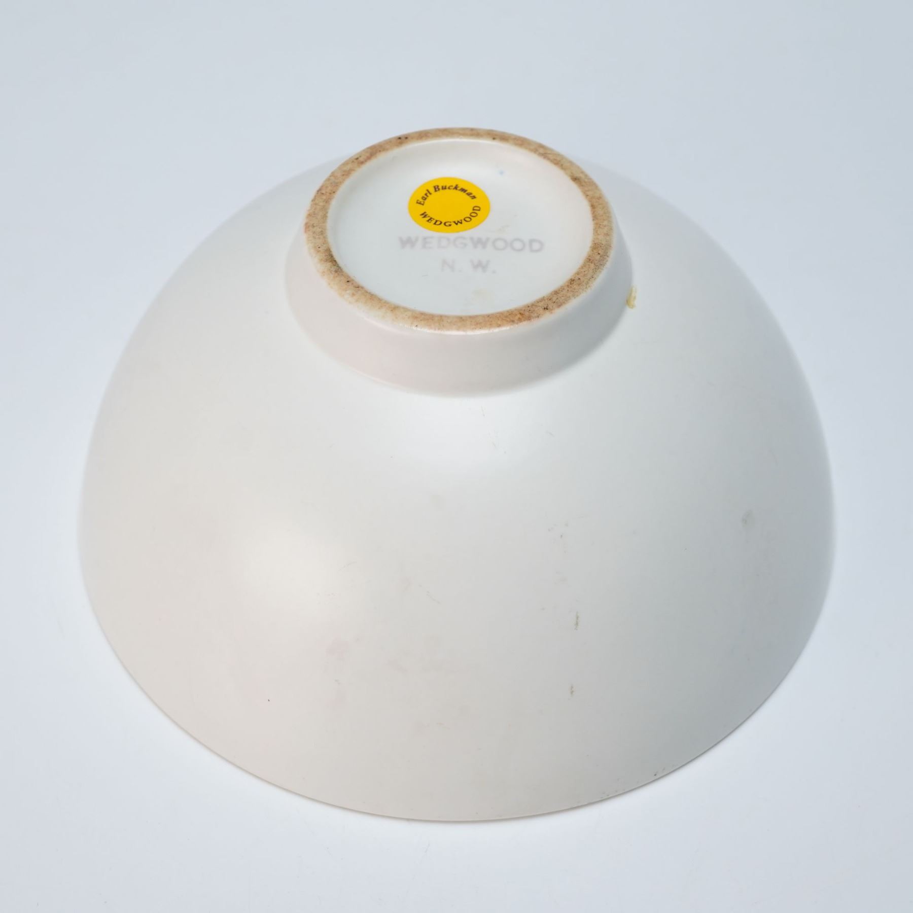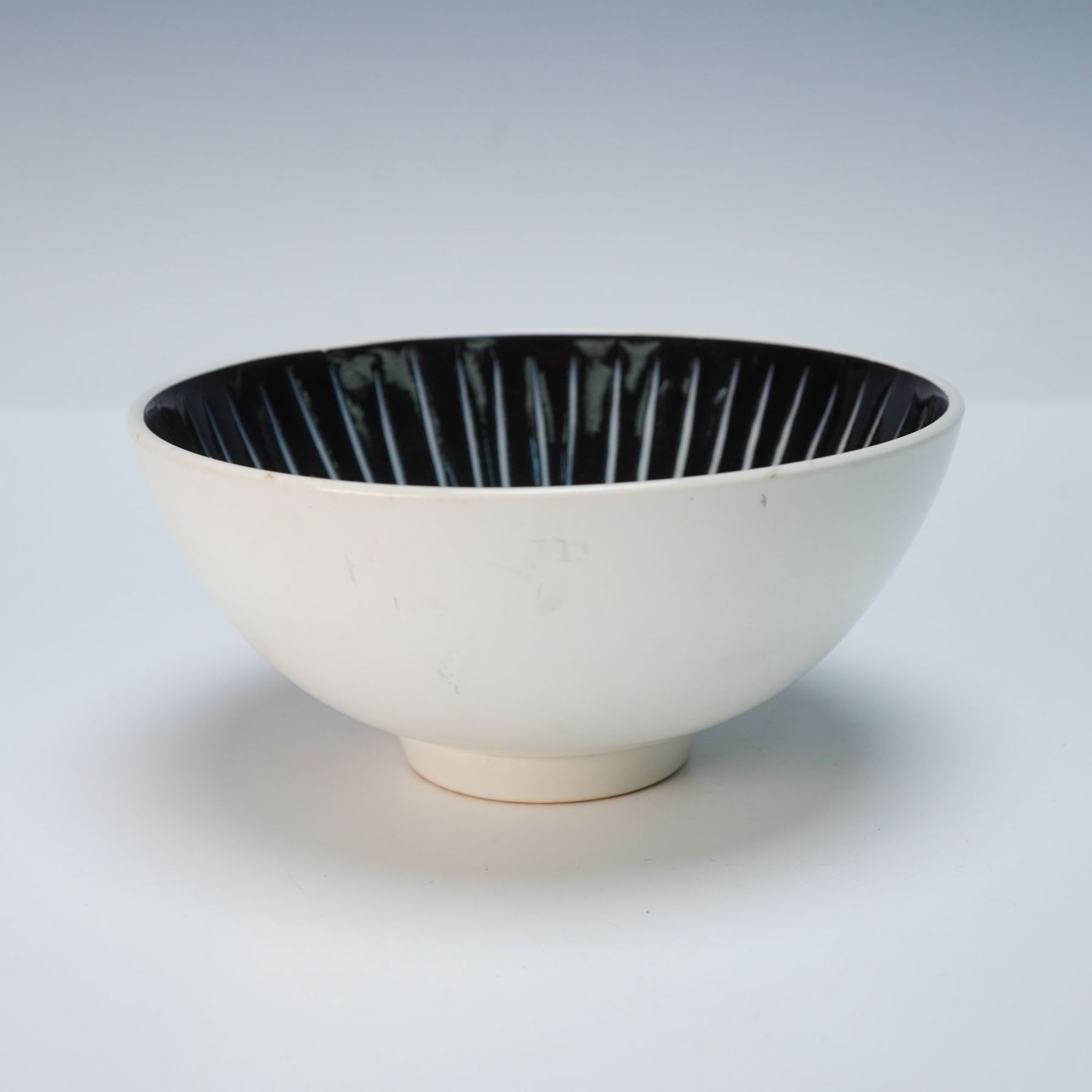 Designed by Norman Wilson, the bowl features a ribbed interior pattern in black on a white ground, with a solid white exterior. Underside marked Wedgwood N.W. Provenance indicated by an applied sticker from the Earl Buckman Wedgwood Collection.