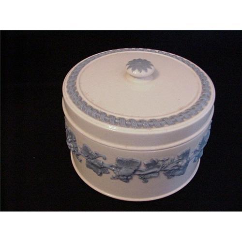 Wedgwood embossed Queensware covered dish, 5 1/4" X 4" Tall. White queensware with raised blue decoration.