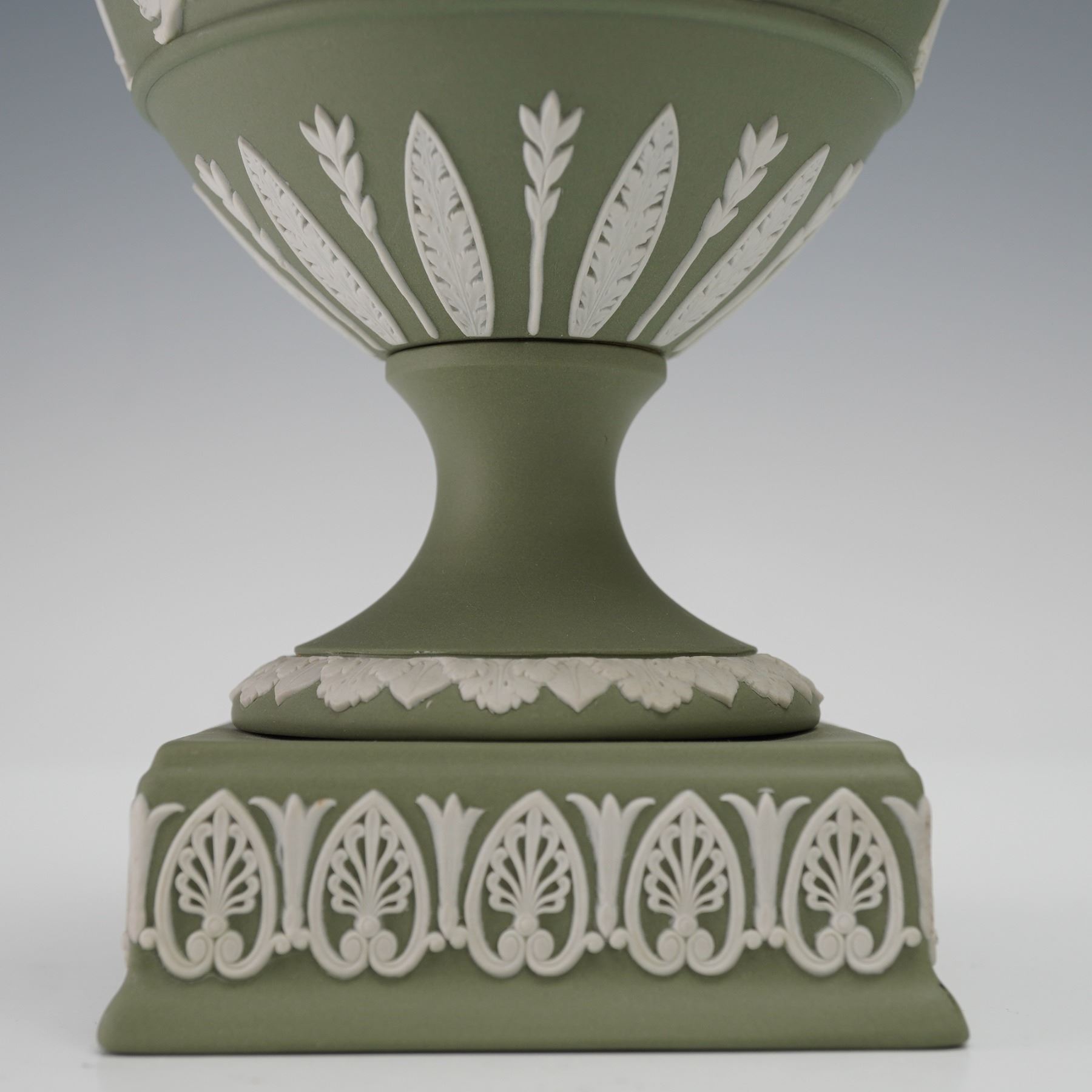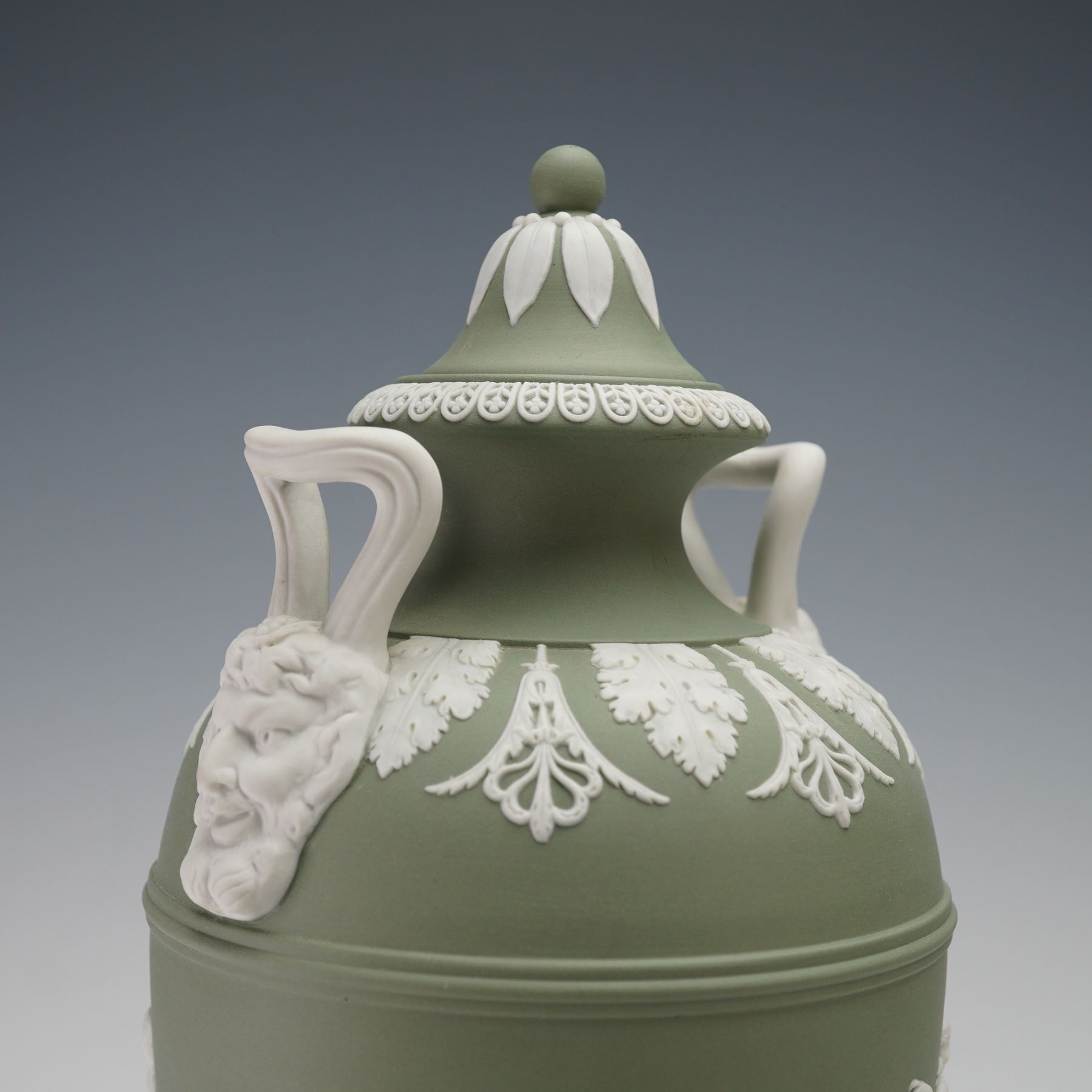 A fine Wedgwood green jasperware lidded urn featuring applied white reliefs of neoclassical maidens in a garland dance motif. The urn is surmounted by a domed lid with foliate detailing and acorn finial, flanked by twin handles terminating in bearded satyr masks. Raised on a square plinth base with repeating anthemion border. Impressed Wedgwood, Made in England, and AW marks to underside.