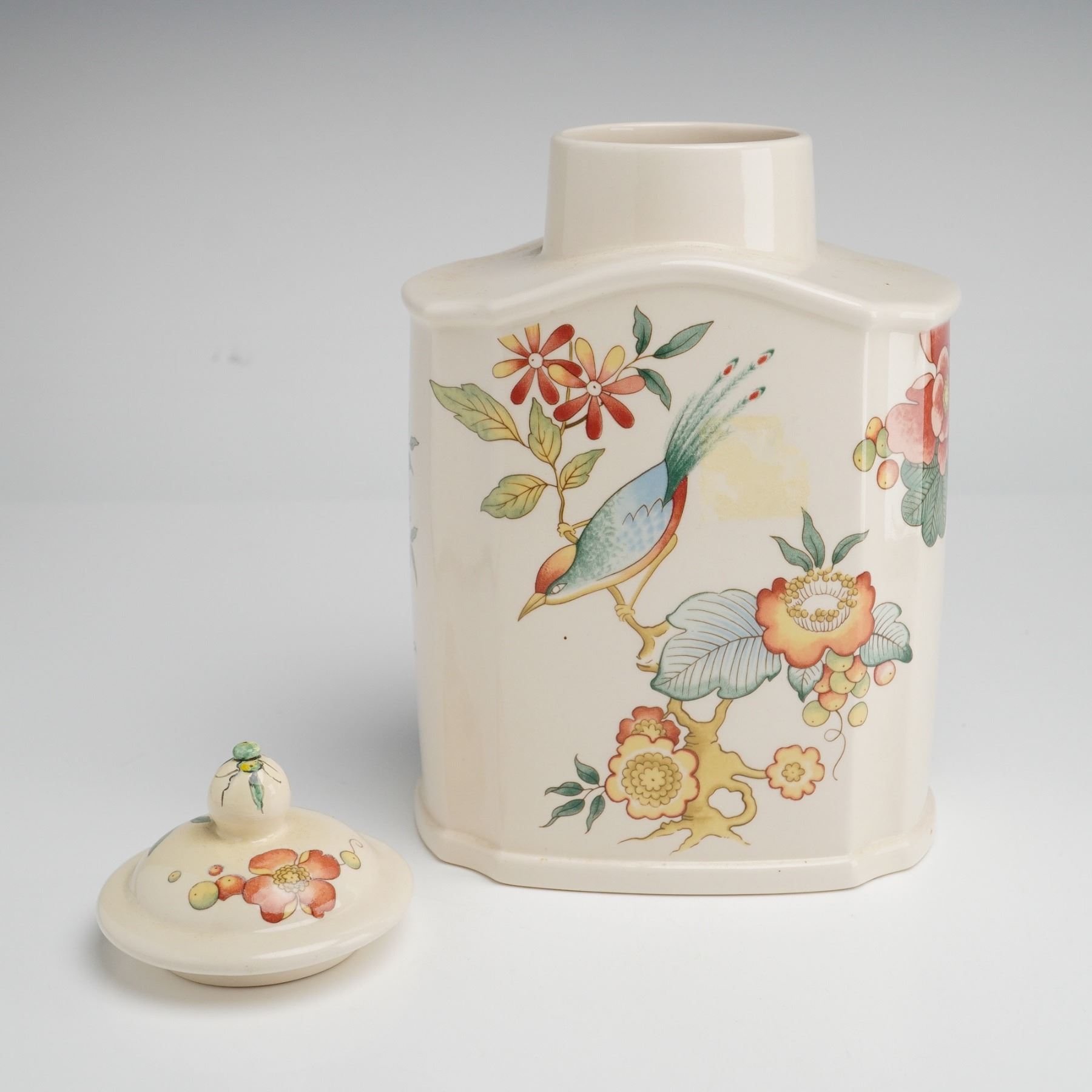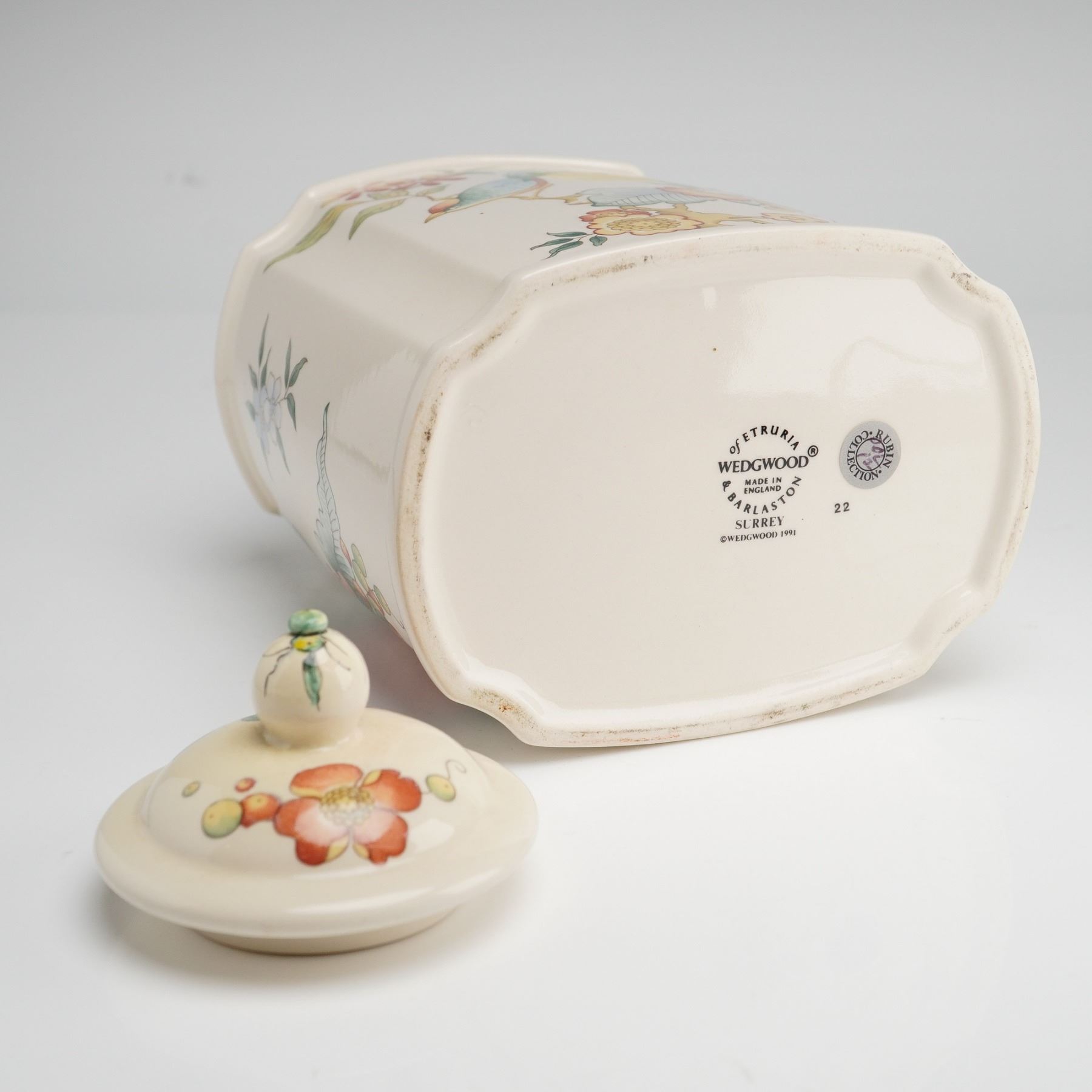A Wedgwood glazed ceramic tea caddy in the Surrey pattern, dated 1991. The vessel features a shaped rectangular body decorated with Chinoiserie-style motifs of birds perched on flowering branches with large peonies in shades of coral, yellow, and blue against an off-white ground. It includes a matching domed lid with a bud finial and similar floral decoration. The underside is marked with the of Etruria and Barlaston Wedgwood stamp, identifying the piece as made in England, along with the pattern name Surrey and the date 1991. A Rubin Collection sticker and the number 22 are also present on the base.
