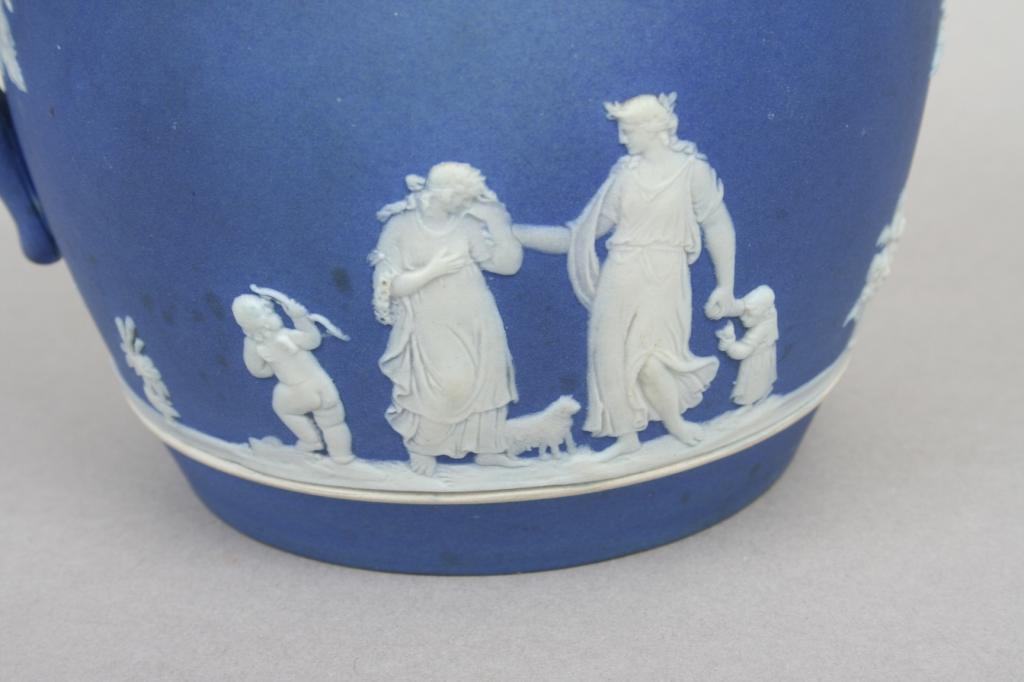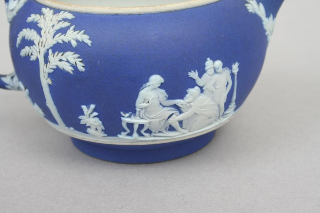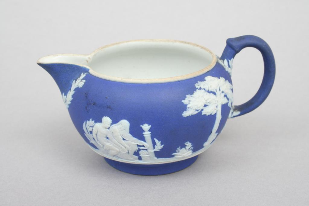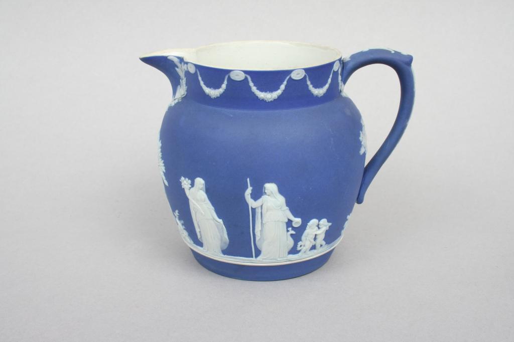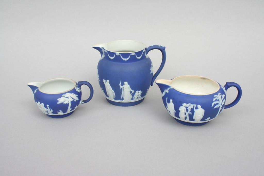 Comprising: a Wedgwood beaker and jug,each molded in relief with a fox hunt scene, the details picked out in polychrome, the beaker stamped in black with Wedgwood Dye Ken John Peel mark, the jug impressed Wedgwood Made in England (beaker 4 1/4"H. Jug 5"H., both crazed, otherwise good); a Copeland jug molded in relief with fox hunt scene on a beige ground, impressed Copeland (4 3/4"H., excellent condition); and an unsigned jug molded in relief with a hunt scene on a cobalt blue ground (6 3/4"H., some scuffs, small firing crack, hairline to interior of base, otherwise good)