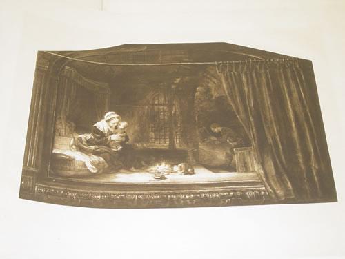 Wedmore, Frederick. Rembrandt - Seventeen of His Masterpieces from the Collection of His Pictures in the Cassel Gallery. London: William Heinemann, Double Elephant - over 25" - 50" tall. Hard Cover. Ex-Library. Portfolio in poor condition, Text & Plates in Very Good Condition. SCARCE. Title [1] 8pp text, 1 List of Plates, Complete with 17 photogravure plates on handmade paper, done by the Berlin Photographic Company. Unbound as issued, in original folding portfolio of 3/4 leather & cloth. Library marks show as light pencil on back of plates. Front cover of portfolio detached, covers bowed, leather flaking.