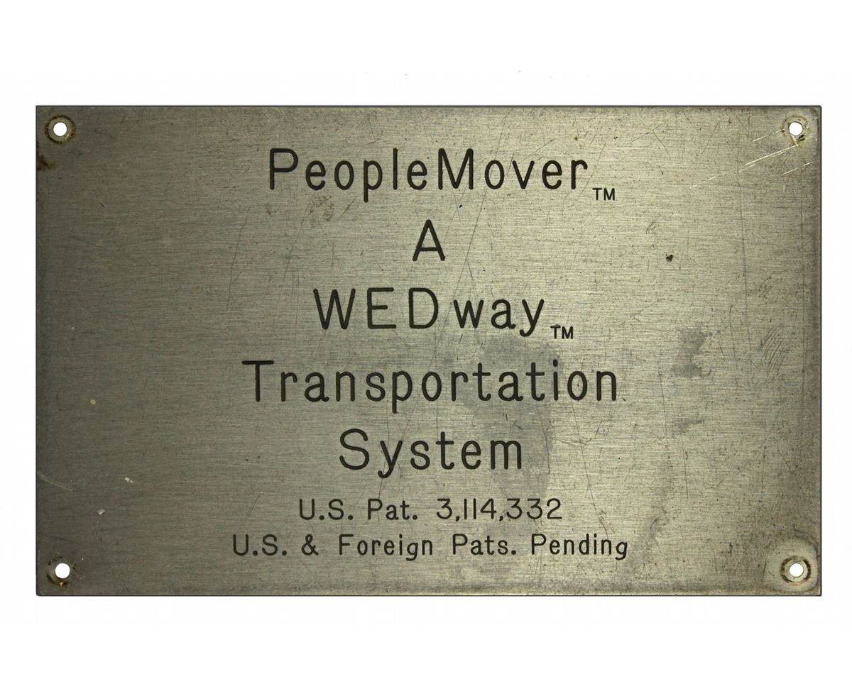 (Disneyland, 1967)A wonderful artifact from the original 1967 WEDWAY Peoplemover attraction. This aluminum plaque was mounted near the operator controls of the attraction, announcing its trademarked and patent pending registration numbers. Removed after the station’s closing in 1998. The plaque measures 8 x 5 in. In very good condition.