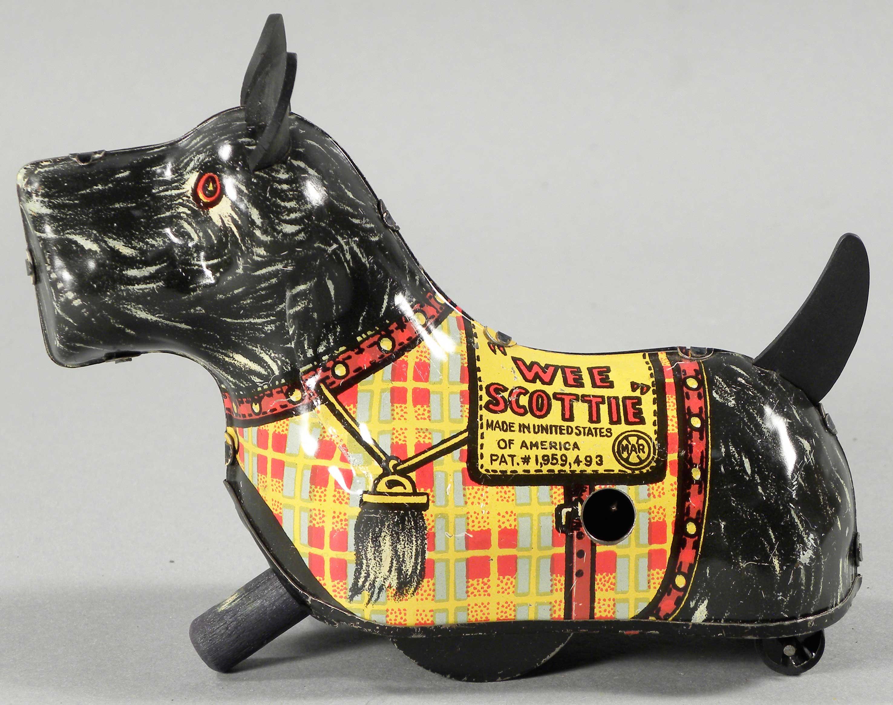 "Wee Scottie" Tin Key-Wind Toy by Marx. Pat # 1959,493. Rubber ears and tail, wood front feet as he moves. Near mint condition, no key. 5 1/4 inches long. Start Price $30