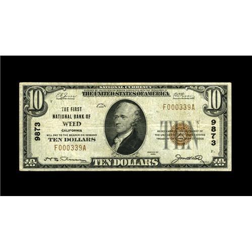 <B>Weed, CA</B></I> - $10 1929 Ty. 1 <B>The First NB</B></I> Ch. # 9873<BR>A <B>Very Fine</B></I> example from an always in demand bank. This note enjoys nice centering, superior color and is problem free for the grade.<BR><BR><b>Shipping:</b> Coin/Currency (<a target="_blank" href="http://www.heritageauctions.com/common/shipping.php">view shipping information</a>)