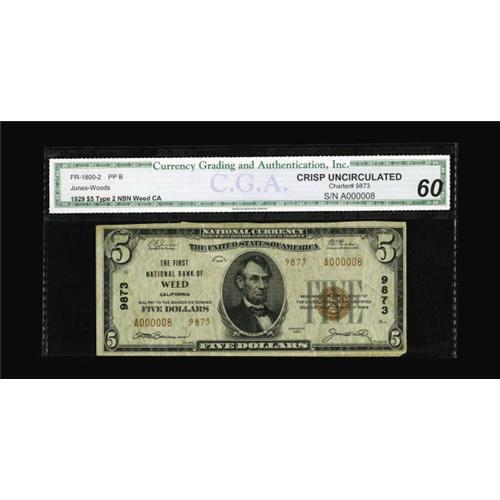 <B>Weed, CA</B></I> - $5 1929 Ty. 2 <B>The First NB</B></I> Ch. # 9873<BR>A nice specimen for the collector of unusual bank names. Prominent embossing is noticed with a little mishandling at lower right. CGA <B>Crisp Uncirculated 60.</B></I>