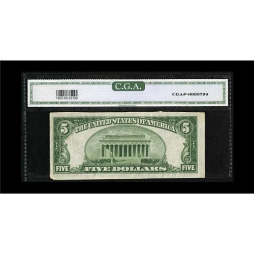 48B. CURRENCY – Notes sold referencing a third-party grading service are sold "as is" without any express or implied warranty, except for a guarantee by Auctioneer that they are genuine. Grading, condition or other attributes of any lot may have a material effect on its value, and the opinion of others, including independent grading services such as PCGS Currency, PMG, and CGA may differ with that of Auctioneer. Auctioneer shall not be bound by any prior or subsequent opinion, determination, or certification by any independent grading service. The grades assigned by any grading service to any note offered in any Heritage Currency Auctions of America sale represent the opinion of that grading service only,and may differ in material respects from the grade assigned to the same note in previous sales by HCAA or other auction companies, or from the grade that would be assigned by any other grading service. HCAA is unable to view any third party graded item outside of the holder, and specifically disclaims any liability of any kind to bidders who bid on third party graded items for mistakes of commission or omission by any grading service. Bidders are hereby notified that currency grading standards have changed in the past and are subject to change in the future, and that the only remedy bidder has with respect to third party graded notes is to deal directly with the grading service certifying the item. Bidders are also advised that Auctioneer makes no representation or guarantee that any item obtained by Bidder will be assigned any particular grade by any particular grading service, and as noted herein, Bidder specifically waives any claim to right of return of any item because of the opinion, determination, or certification, or lack thereof, by any independent grading service. Certain warranties may be available from the grading services and the Bidder is referred to them for further details: Paper Money Guaranty (PMG), PO Box 4711, Sarasota FL 34230; PCGS Currency, PO Box 9458, Newport Beach, CA 92658; Currency Grading & Authentication (CGA), PO Box 418, Three Bridges, NJ 08887.