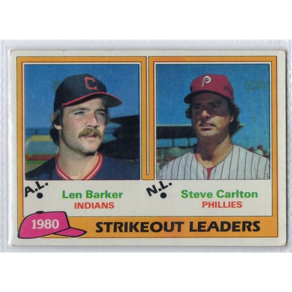Carlton & Barker 1981 Topps 1980 Strikeout Leaders Card number 6. Left side of the card is not frayed. That is the penny sleeve causing the appe...