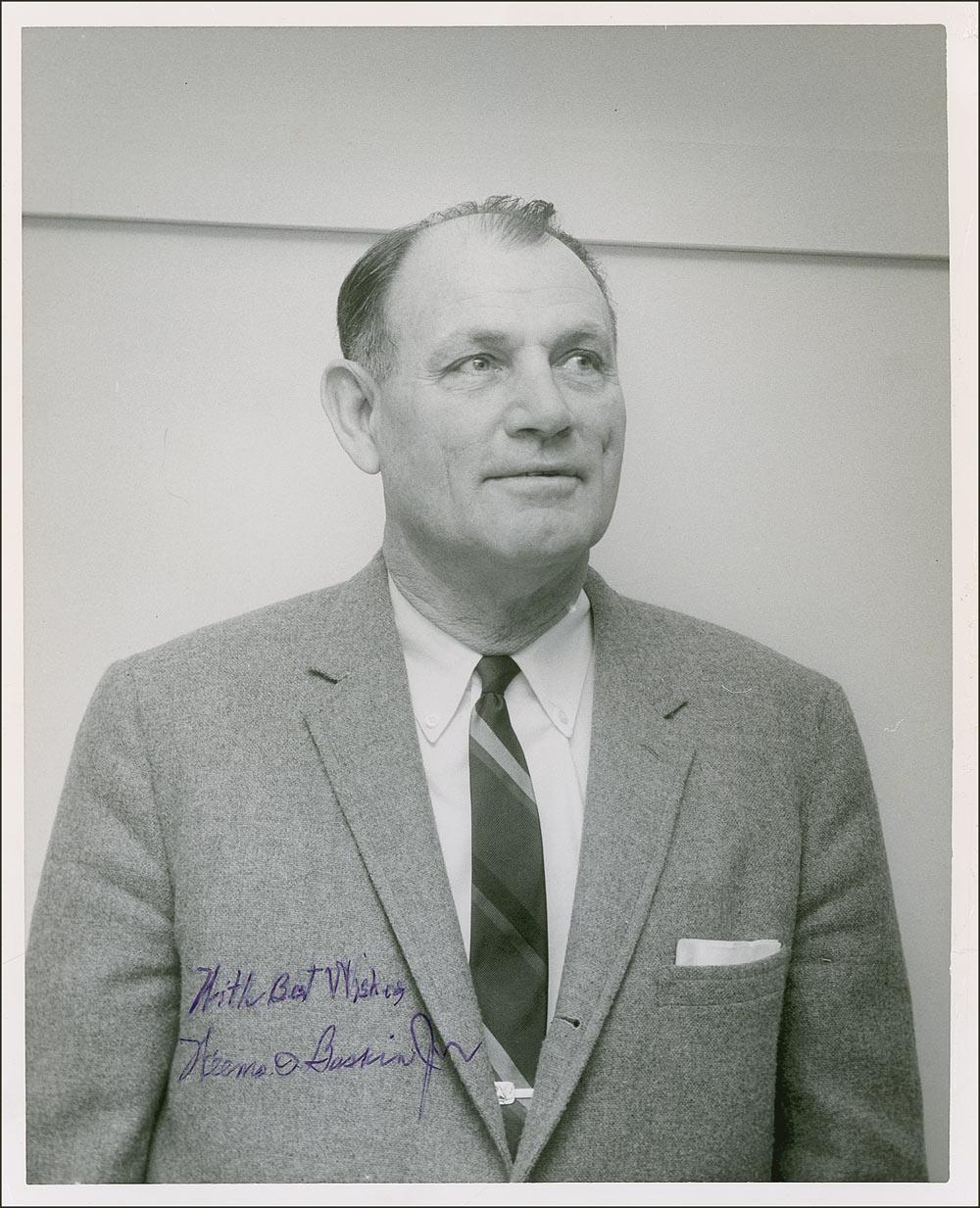 Vintage glossy 8 x 10 photo, signed in purple ink, “With best wishes, Weems O. Baskin Jr.” In very good condition, with Baskin writing over an unsuccessful first attempt at sentiment, a bit of irregular ink adhesion to first name of signature, and scattered creases and surface marks.