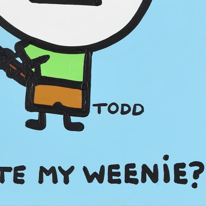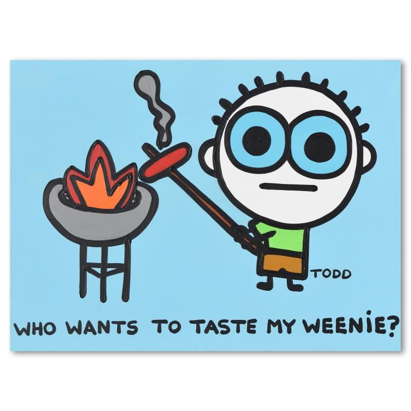 We acquired this piece as part of a larger collection. We do not approve of its inappropriate content. "Weenie" is an original acrylic painting on gallery wrapped canvas by Todd Goldman, hand signed by the artist. Includes Letter of Authenticity. Measures approx. 48" x 36" (image). Due to the way this piece was stored there may be minor wear or signs of age (such as wear on the corners) but the piece is in overall good condition.