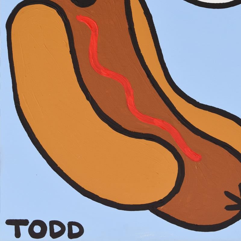 "Weenie" is an original acrylic painting on gallery wrapped canvas by Todd Goldman, hand signed by the artist. Includes Letter of Authenticity. Measures approx. 24" x 36" (image). Due to the way this piece was stored there may be minor wear or signs of age (such as wear on the corners) but the piece is in overall good condition.