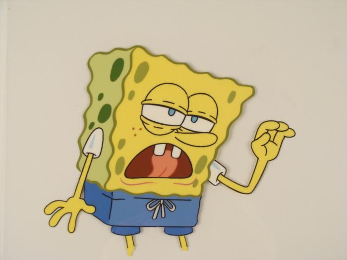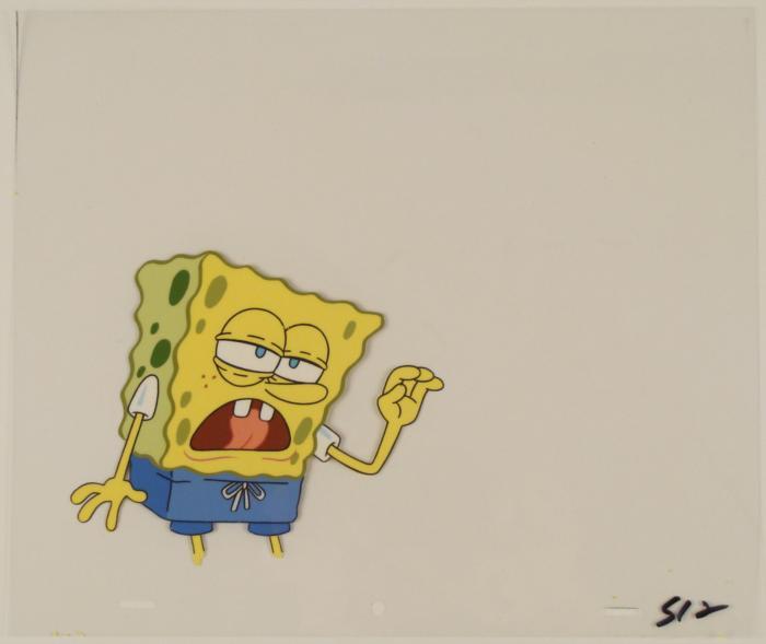 This original animation cel is from the Nickelodeon TV show SpongeBob Squarepants. The story takes place under the deep blue sea in Bikini Bottom, where SpongeBob resides. SpongeBob, who is a yellow, porous sponge, is your typical happy-go-lucky character, as he is always cheerful and enjoys making people laugh. Patrick Star, SpongeBob's neighbor who is a starfish, is your average children's show idiot, as he boasts knowing nothing and is often getting himself into ridiculous situations. Between the homes of these two lies the home of the miserable Squidward, a squid, who is known for being grouchy and playing tricks on SpongeBob and Patrick. Both SpongeBob and Squidward work at the Krusty Krab, a fast food business run by the greedy money-loving Mr. Krabs, a crab, the arch rival of the evil, possibly misunderstood, Plankton. Another neighbor, Sandy Cheeks, an athletic squirrel who normally wears an astronaut's space suit, was introduced in "Tea at the Treedome." She spends most of her time inventing and experimenting. SpongeBob appears to be weeping.Original Production Animated Cel Overall Size of Cel: 10 1/2" x 12 1/2" Very Good ConditionThis is an original hand-painted cel set-up used in the production of an episode of "SpongeBob SquarePants." Each one-of-a-kind set-up represents a slight change in position of the characters. When individually photographed and projected in rapid succession, the images appear to move.
