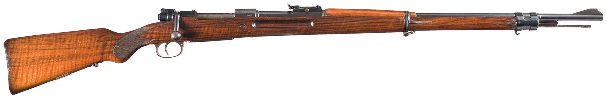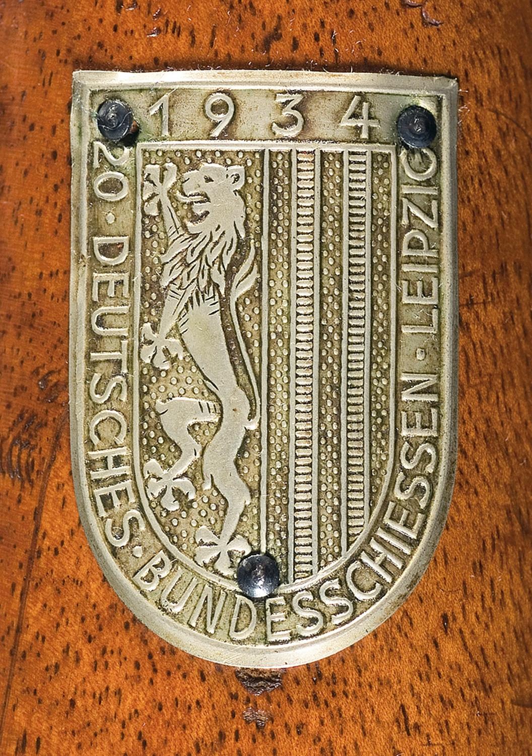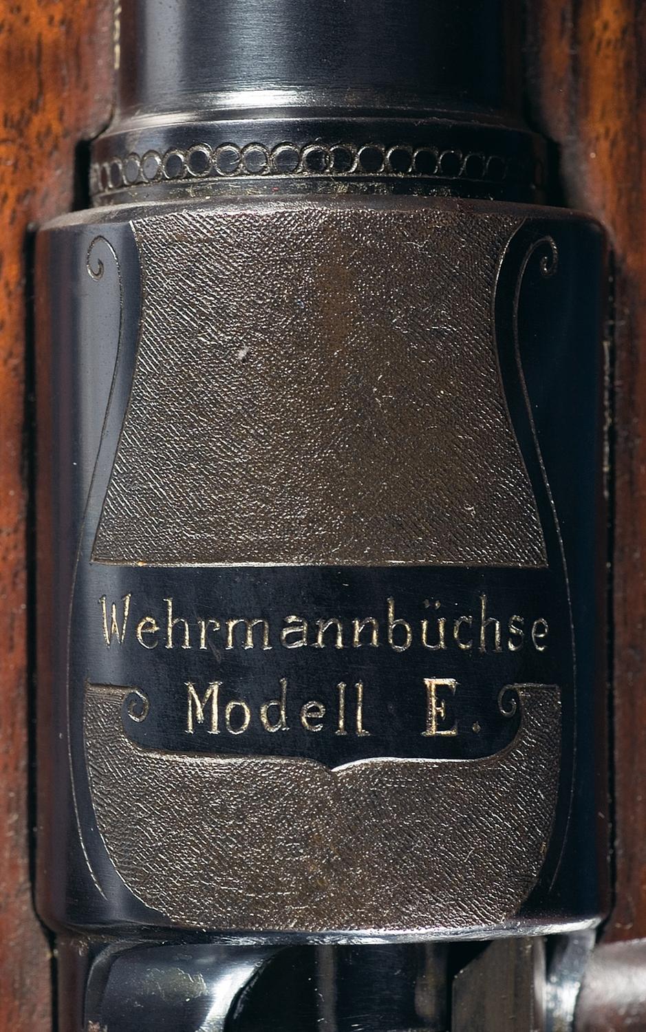 This is a unique example of a Model 98 "Serviceman's Target rifle". Light sporter weight Bohler Stahl barrel with ramp front sight,( blade absent) and adjustable rear military style sight with "100" and "175" graduations. The top of the barrel is marked "Bohler star Stahl", the upper left side is marked with an Imperial eagle "crown /N Nitro" and below that is the serial number followed by a shield with U.A. / Z" inside and "815x46NOR". The top of the receiver ring has a matte finish and marked "Wehrmannbuchse / Modell E" on a raised panel. Mauser type action with the side wall drilled and tapped for a scope rail, (which is absent). The floor plate is engraved "FU". Mounted with a full length round knob pistol grip stock with forearm finger grooves, checkering on the bottom ahead of the floor plate and wrist, and a flat steel buttplate. There is a silver plaque affixed to the underside of the stock which reads "1934" at the top and "20 DEUTSCHES BUNDESSCHIESSEN LEIPZIG". Complete with a slotted cleaning rod.