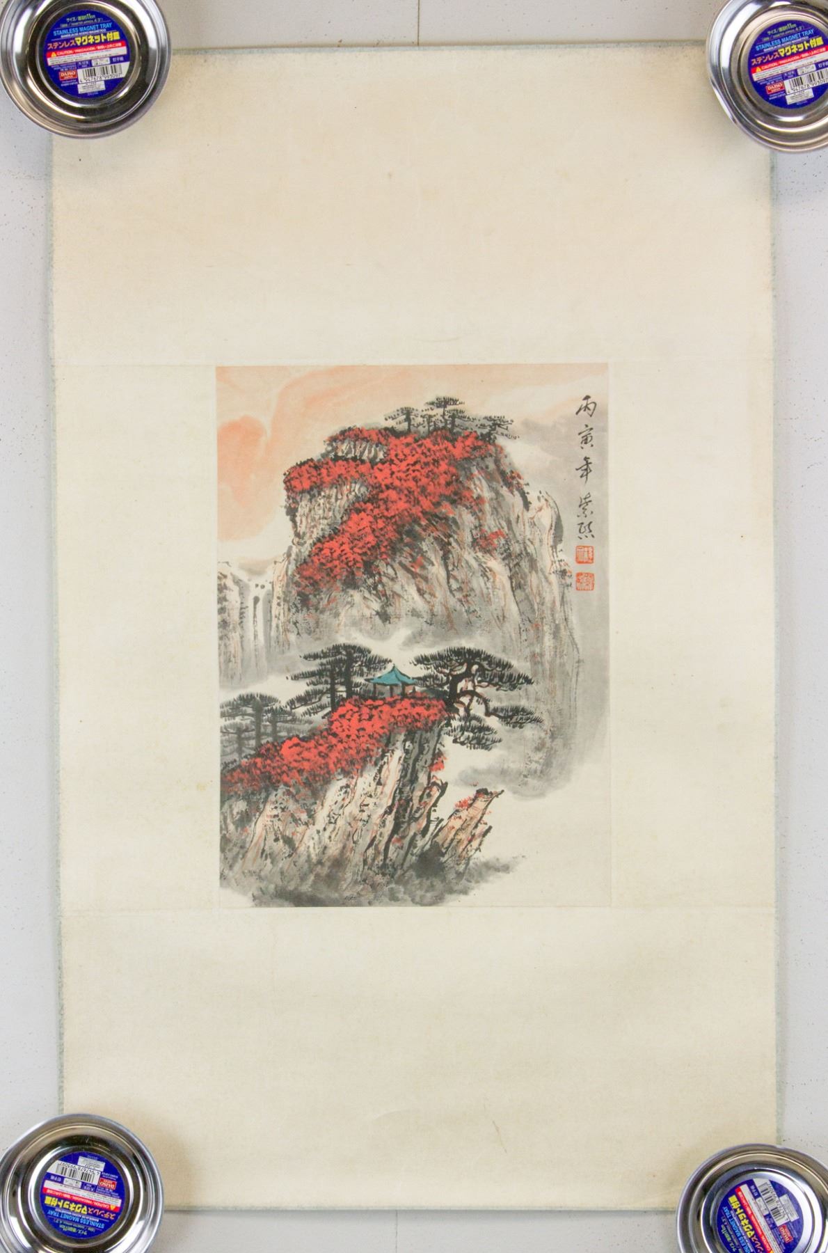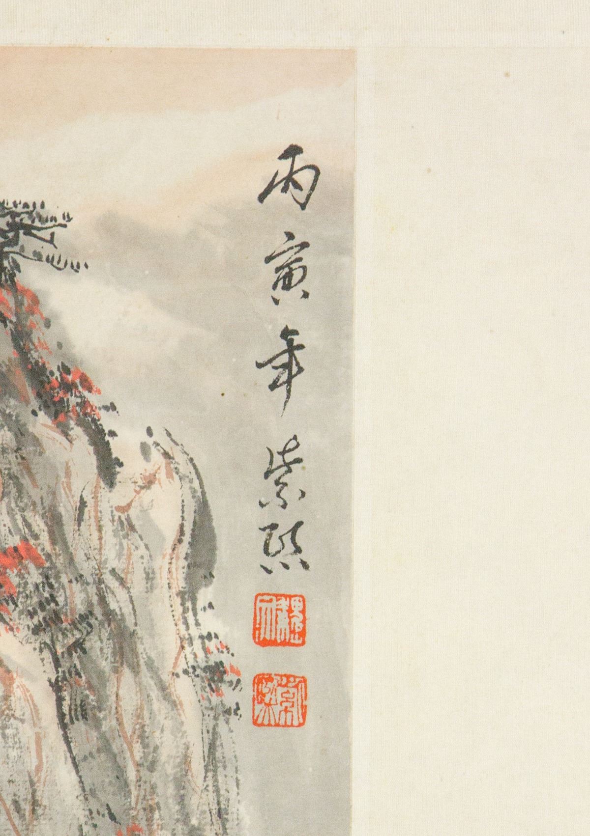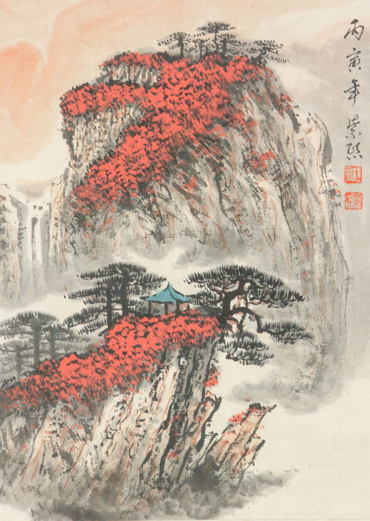 Ink and watercolor on paper roll. Featuring mountainous landscape with pavilion in autumn. Signed Wei Zixi 1915-2002 Chinese, inscribed with 2 artist seals. 34 × 24.5 cm