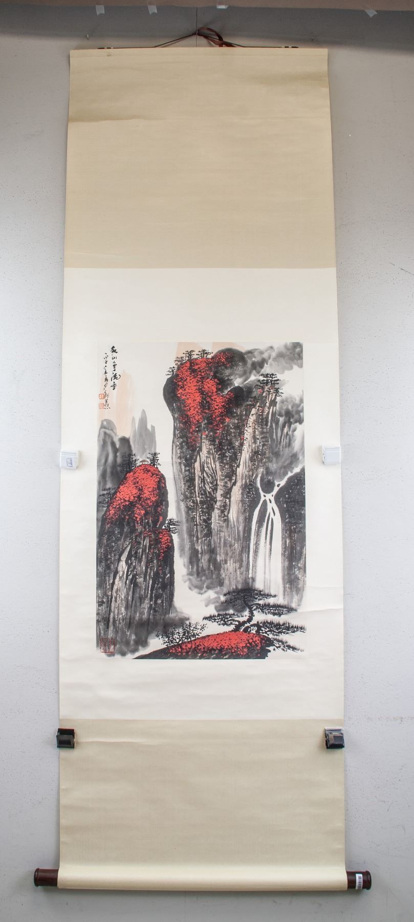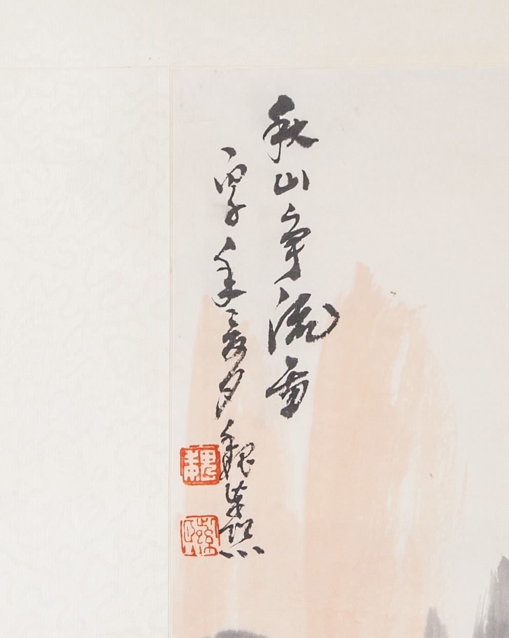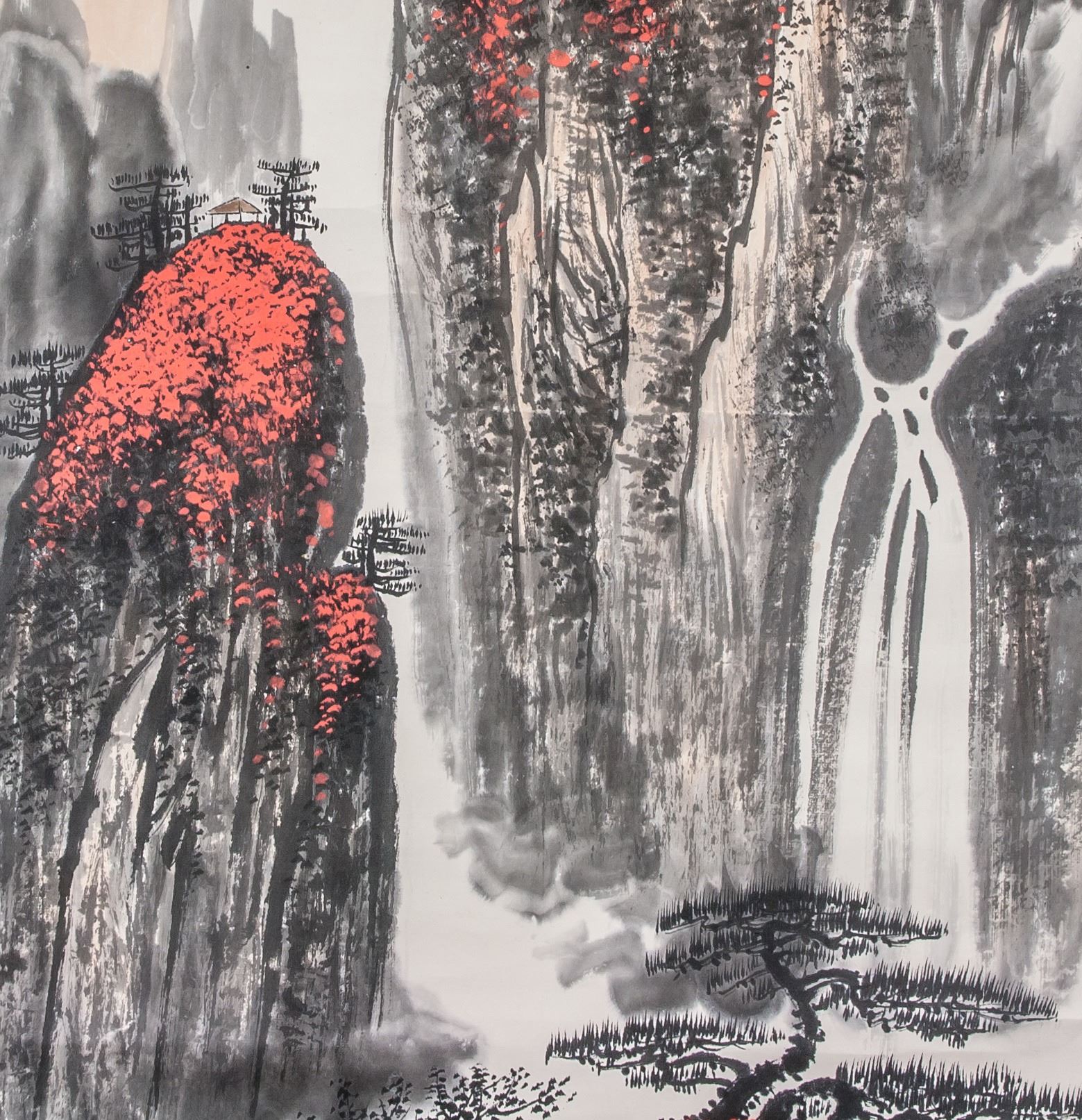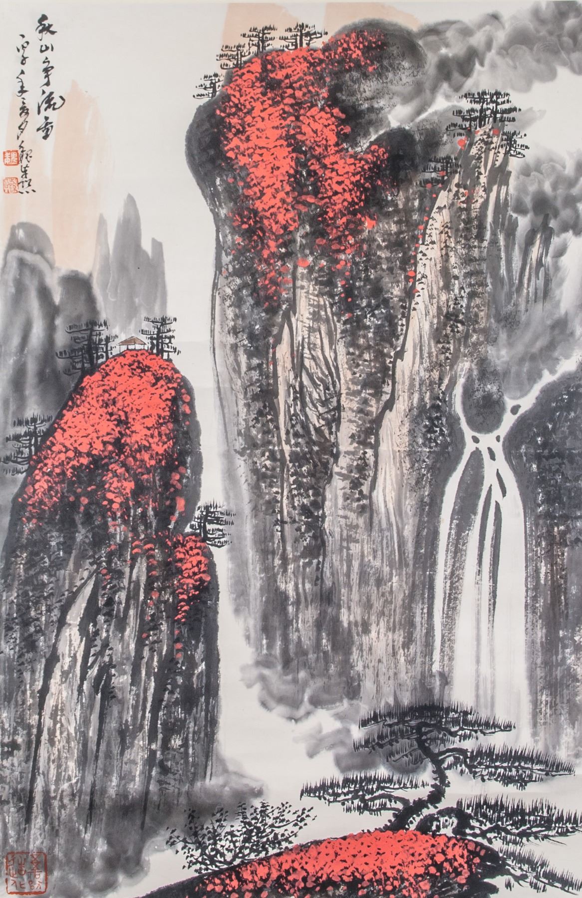 Mountainous landscape with waterfall; Chinese ink and watercolour on paper; hanging scroll; signed Wei Zixi (1915-2002), Chinese painter; inscribed with 3 artist seals; 68 cm x 45 cm