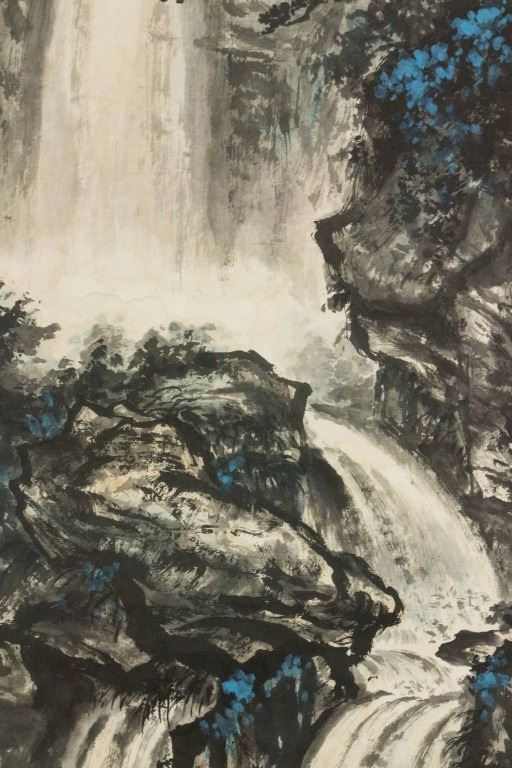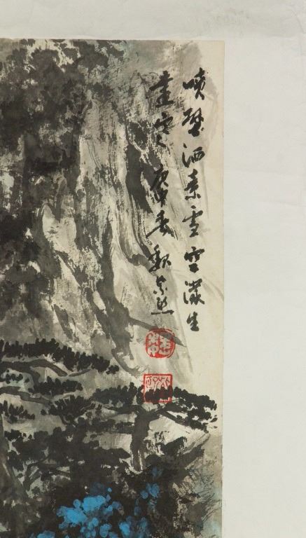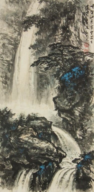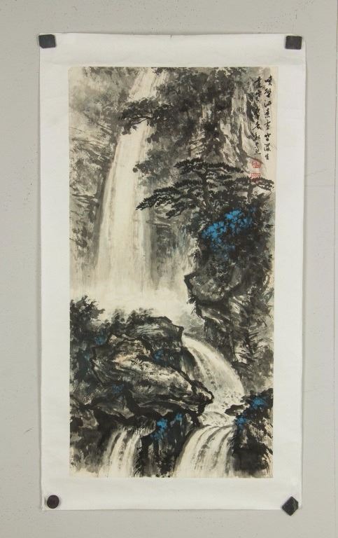 Mountainous landscape with waterfall; Chinese ink and watercolour on paper roll; signed Wei Zixi (1915-2002); inscribed with 2 artist seals; 65.5 cm x 33 cm