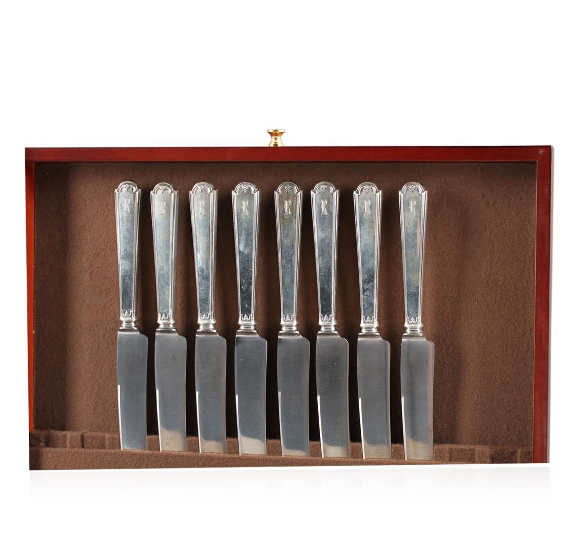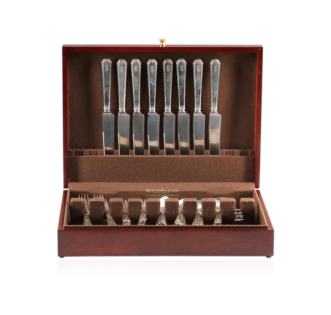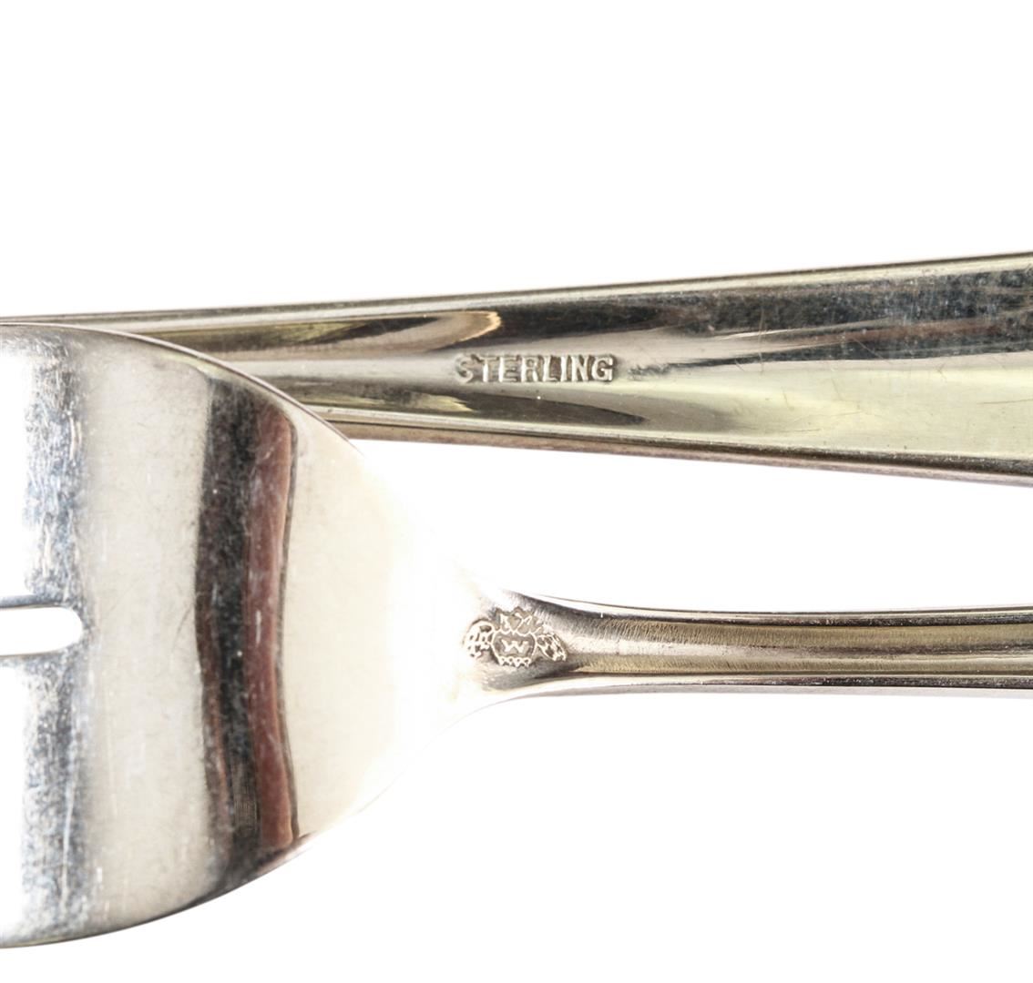 Beautiful Weidlich Sterling Co 52 piece Priscilla pattern sterling silver flatware set for eight. This set consists of eight 7.5" dinner forks, eight 5.75" dessert forks, eight 5.5" bouillon soup spoons, seven 5.75" individual butter knives, thirteen 5.75" teaspoons, and eight 9.5" dinner knives with weighted handles and steel blades. Comes in a new flatware chest.
