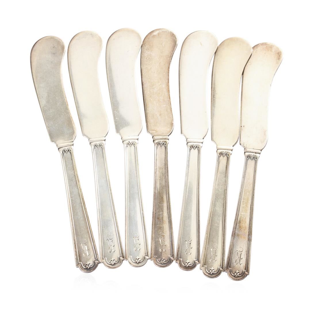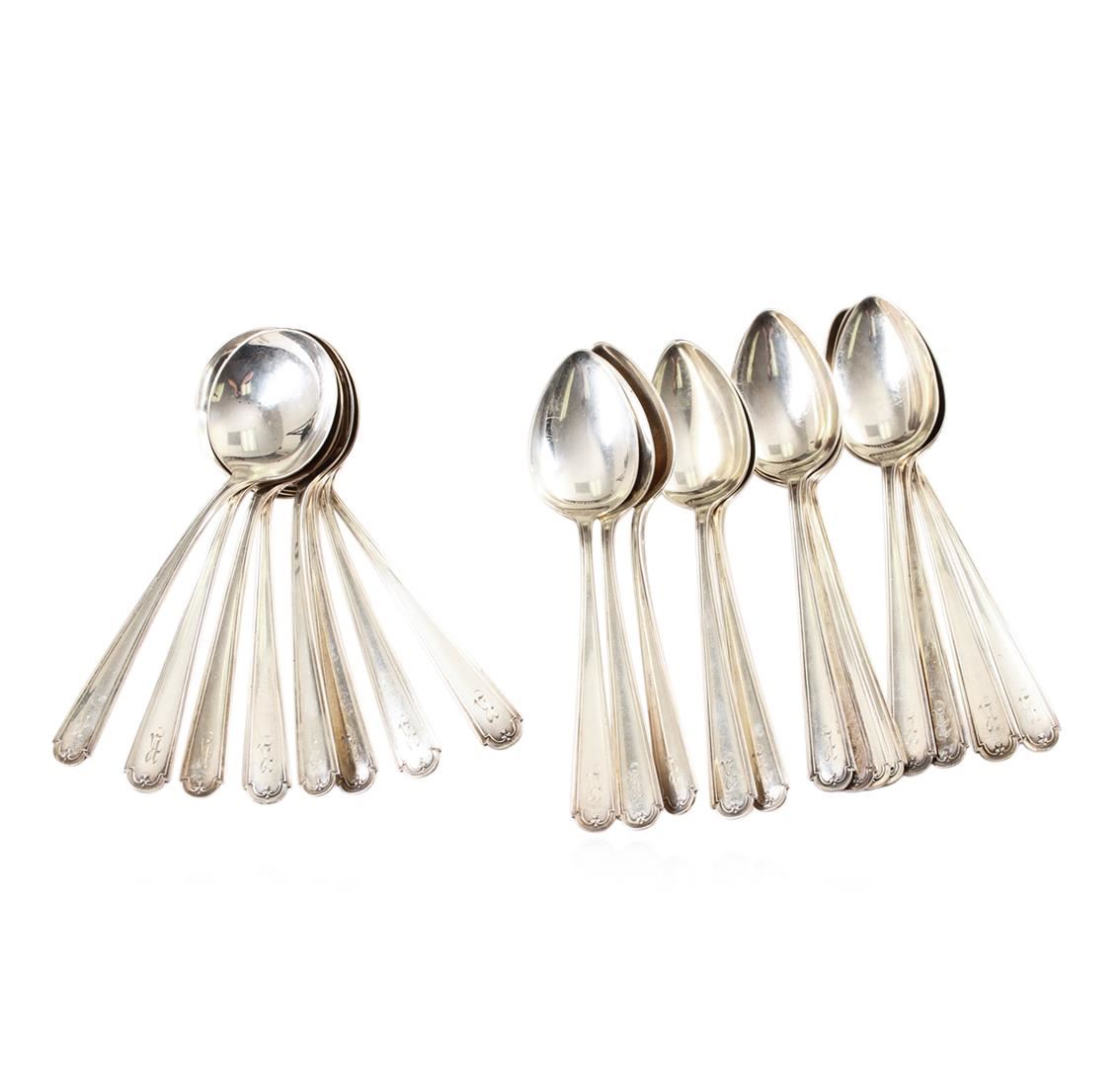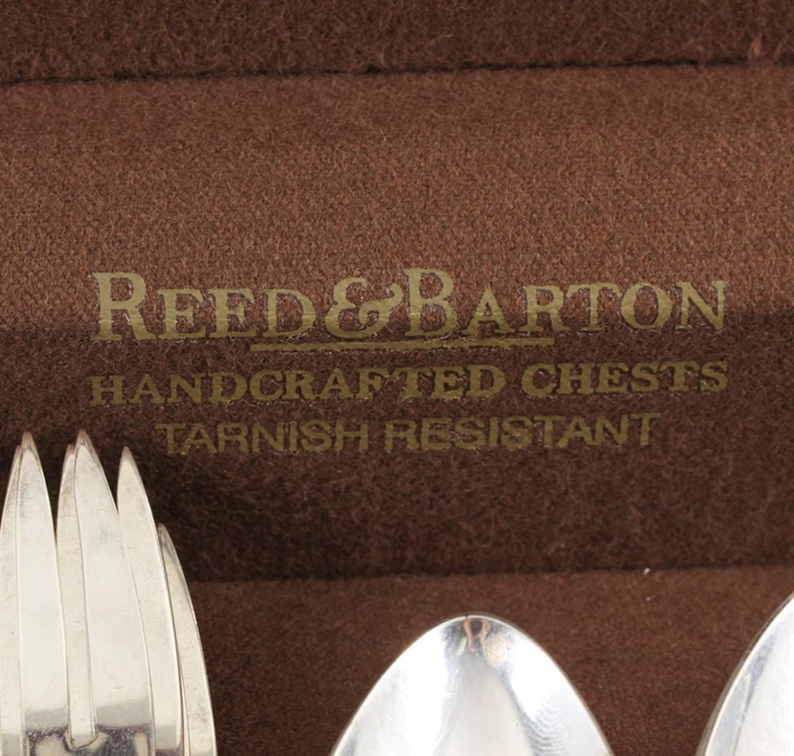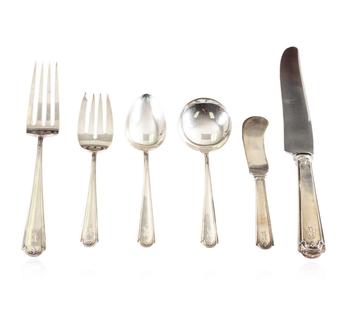 Beautiful Weidlich Sterling Co 52 piece Priscilla pattern sterling silver flatware set for eight. This set consists of eight 7.5" dinner forks, eight 5.75" dessert forks, eight 5.5" bouillon soup spoons, seven 5.75" individual butter knives, thirteen 5.75" teaspoons, and eight 9.5" dinner knives with weighted handles and steel blades. Comes in a new flatware chest.