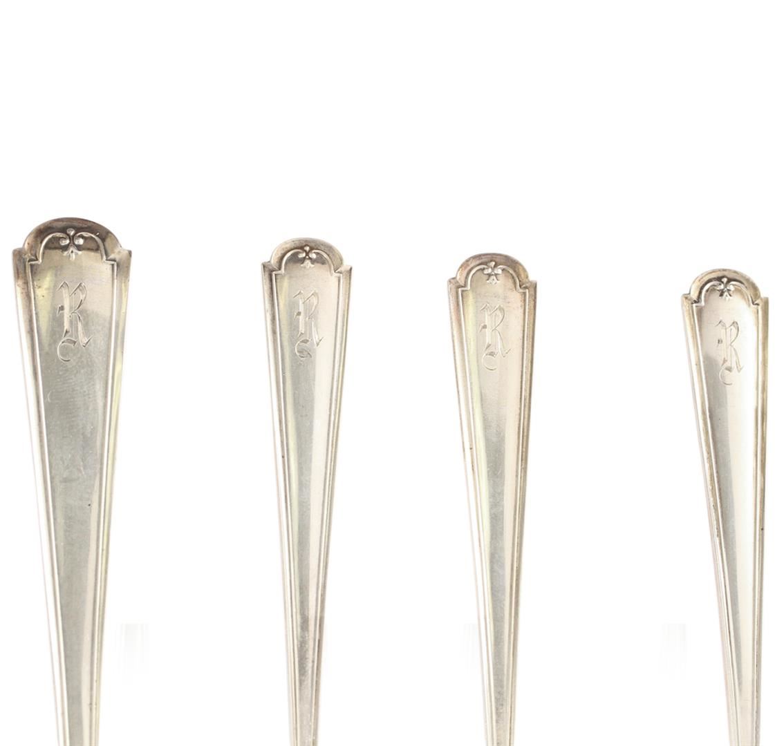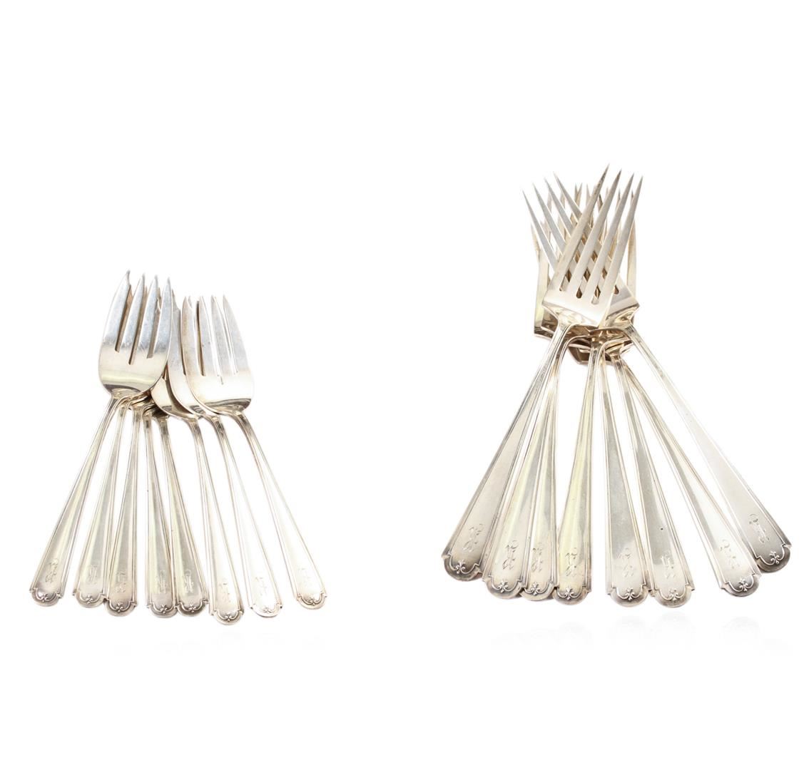 Beautiful Weidlich Sterling Co 52 piece Priscilla pattern sterling silver flatware set for eight. This set consists of eight 7.5" dinner forks, eight 5.75" dessert forks, eight 5.5" bouillon soup spoons, seven 5.75" individual butter knives, thirteen 5.75" teaspoons, and eight 9.5" dinner knives with weighted handles and steel blades. Comes in a new flatware chest.
