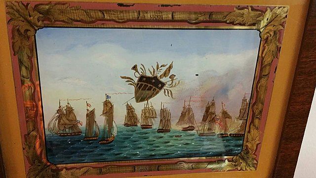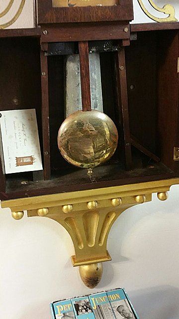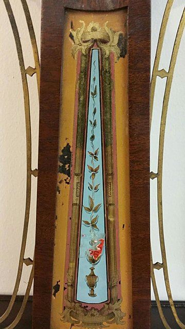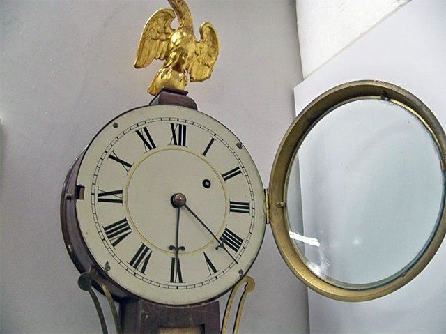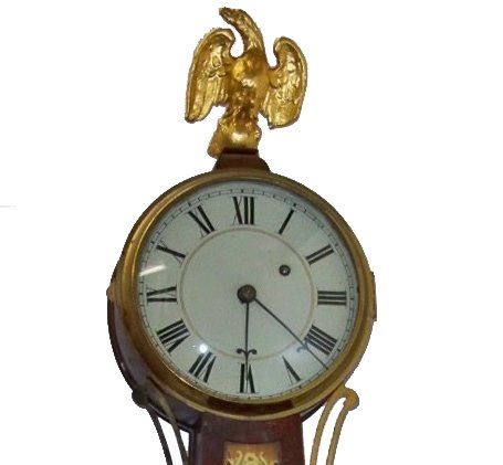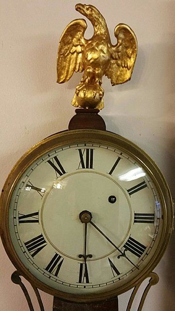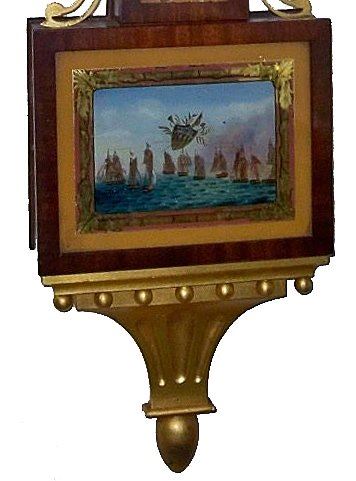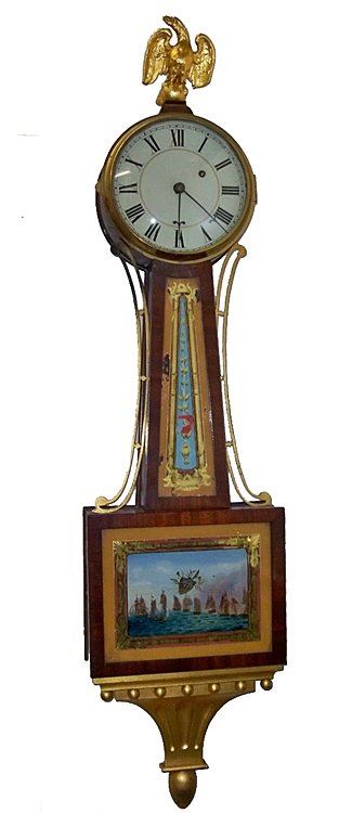 Weight driven antique Presentation Banjo clock, c. 1820's, mahogany case with brass bezel and Roman numeral painted dial, gold gilted base, gold eagle, brass side brackets, beautiful reverse painted glass lower tablet and throat. Beautiful reverse painted glass with sailing ships and American seal apeture, bordered by ornate gold fancy edging, gold leaves from urn and matching border adorn the throat, beautiful brass pendulum. This timepiece is a beautiful example of the Presentation Banjo Clocks of the 1820s. Note: tip of eagles wing broken.