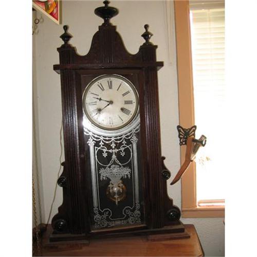 Weight Driven shelf Clock, stenciled door, ca 1880... restored by Mr. Reinhard Beil, (1923-2006), Keeps good time.