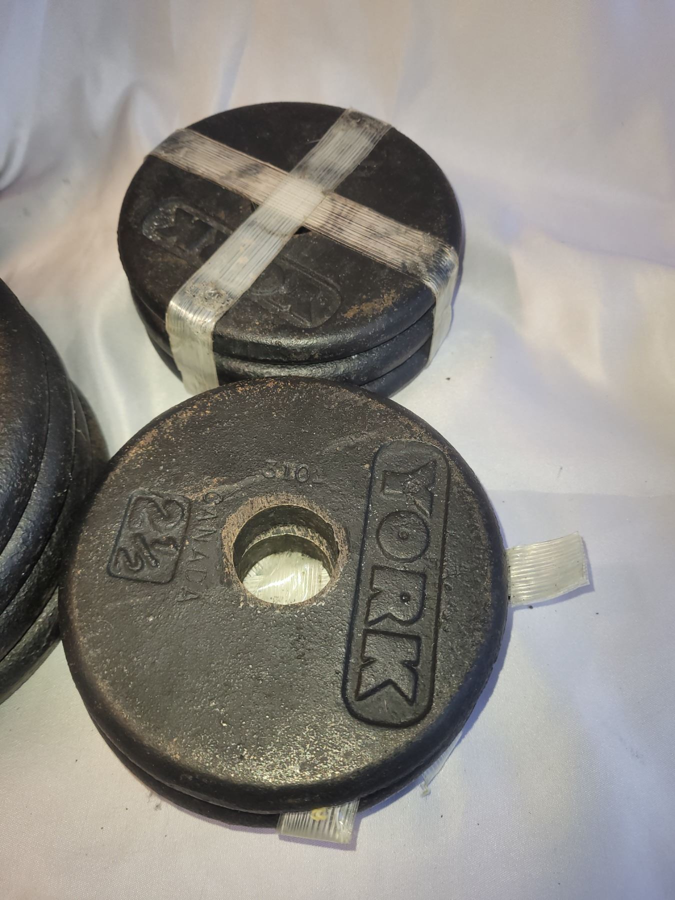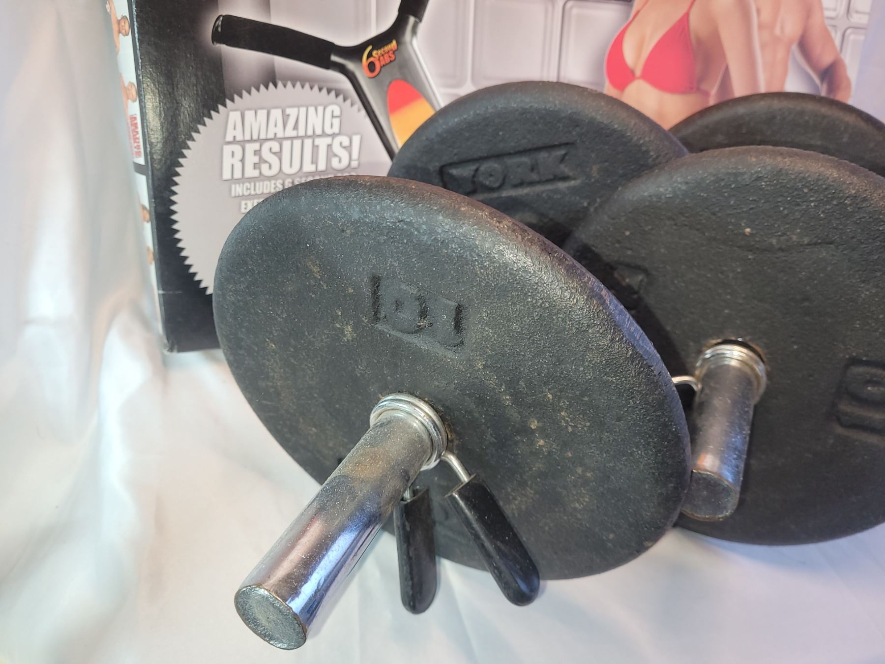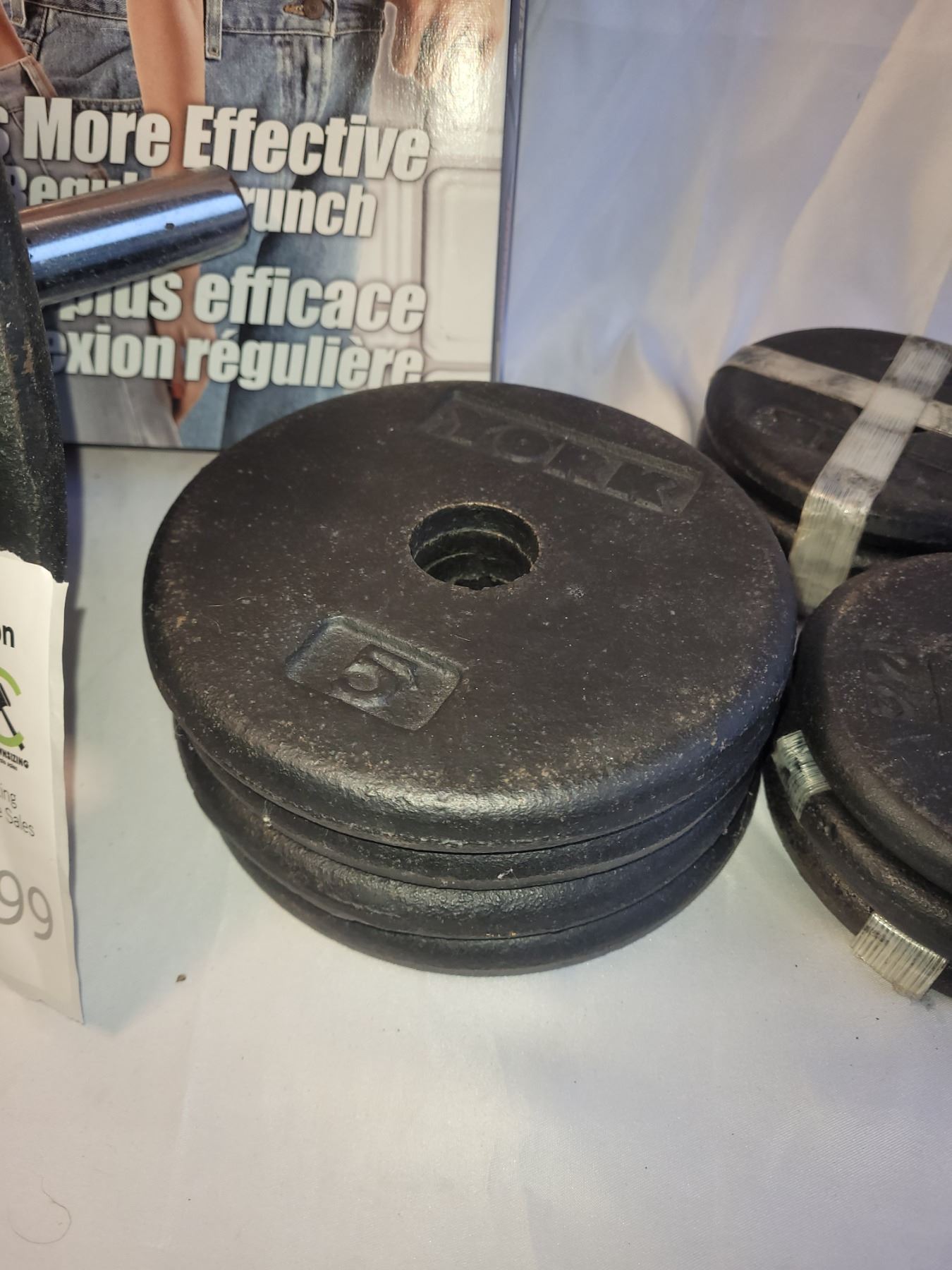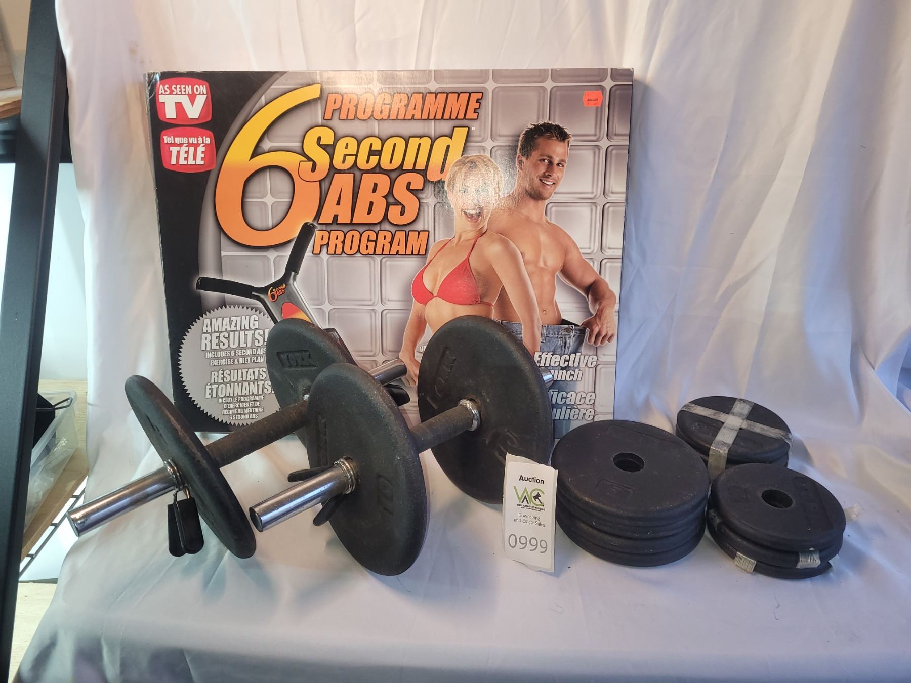 2 x 10Lbs, 2 x 5Lbs & 2.5 lbs metal weights. Abs exerciser and diet plan. Pickup at 9 am