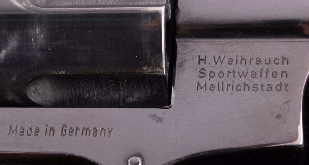 This is a Hermann R. Weihrauch Sportwaffen Model HW357 Arminius .357 Magnum caliber double action six shot revolver. The revolver has a deep blue gloss finish with red and black speckled early form fitted grips. Marked on the right side, "H. Weihrauch Sportwaffen Mellrichstadt - Made in Germany - FIE Miami, FLA - 1001074" and the left side, "Kal. .357 Magnum - HW357 - Arminius." Imported by FIE of Miami, FLA. Excellent service revolver. The pistol shows very good condition with some handling holster wear. Serial number 1001074.
