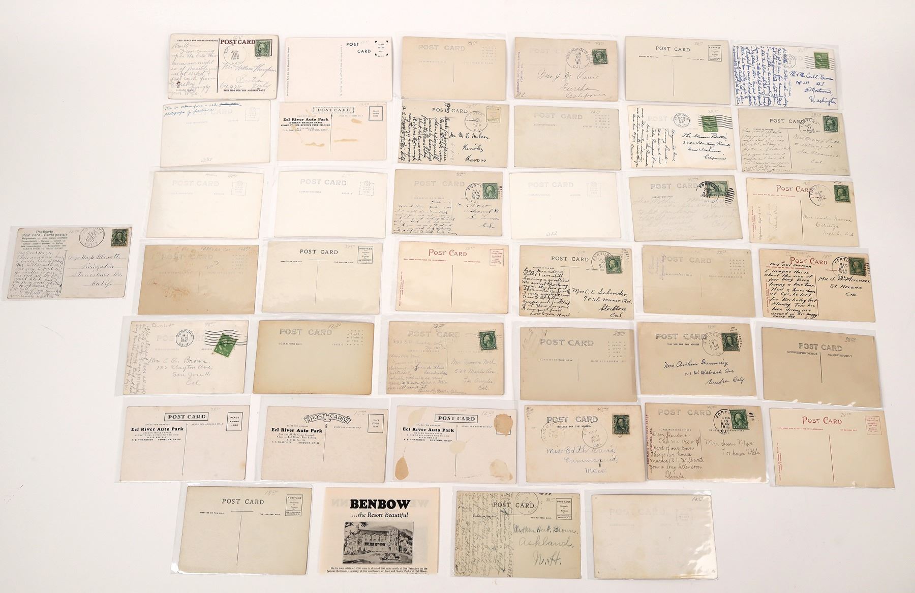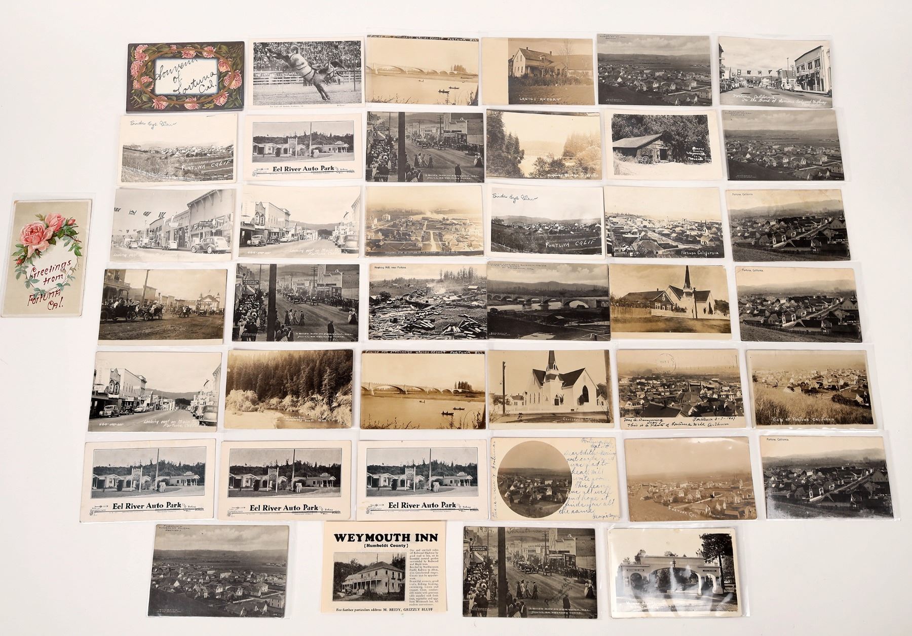 Lot of 42. Twenty-two RPC's, two pre-split, article on Weymouth Inn. Post marks: Fortuna, Scotia, Ferndale, Metropolitan CA. Street level views i.e: Eel river and Hiway bridge Dyerville, Weimar Sanitarium, Eel River Auto Park (4 ad cards), rodeo cowboy being thrown and churches. BIrdseye View: Largest concrete bridge in U.S at the time Fortuna, Ca.( three cards), Newburg Mill. Fourteen diff. views of Fortuna. Street scenes: Eight different era scenes from 1910-40's. California Fortuna 1903-49 Ken Prag Collection