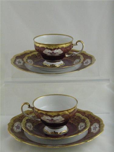 Circa 1918-1949, (2) Three piece sets consisting of cup, saucer and dessert plate. Burgundy over white porcelain relief, highlighted with gold gilded decoration. Marked: Crown over shield with wreath "Weimar, Weimar Porzellan, Made in Germany Katharina 40052 46". Weimar Porcelain, C & E Carstens, Porcelain Factory, Blankenhain, Thuringia, Germany, Hard paste porcelain. Condition: No damage noted. Dimensions: Cup - 2.5"H x 3.75"D, Saucer - .75"H x 5.75"D, Plate .75"H x 8.25"D.