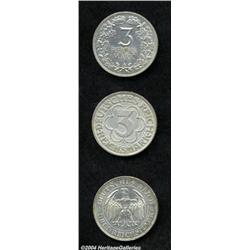 <B>Weimar Republic 3 Mark Trio, </B></I>KM46 Rhineland 3 Mark 1925-A, XF lightly lacquered, KM52 Nordhausen 3 Mark 1927-A, XF+ and KM65 Meissen 3 Mark 1929-E, XF lightly cleaned. 3 coins <BR><BR><B>Important notice:</B> Heritage usually auctions material at the rate of 200-250 lots per hour. On some occasions eBay Live bid software or the Internet may not be able to keep up with the pace of the auction. We recommend placing a realistic absentee bid now as insurance to avoid disappointment. Occasionally the auctioneer may eliminate or reject an eBay Live bid, and the auctioneer may also reopen a lot after the close of the eBay live bidding (usually because we missed an audience bid), and may reject your bid even if it shows you as the winning bidder. By bidding via eBay Live, you agree that Heritage may award the lot to another bidder at its sole discretion under the circumstances described above or any other reasonable circumstances. Since eBay bids are not shown to us until we open the lot on the floor, we treat those bids just like floor bids. In most cases the floor responds before the eBay bid is presented to us, due to Internet lag time, so for consistency we have made it a policy that floor bids are always considered first over tie eBay live bids. Also please note that all Heritage lots purchased through eBay Live carry a 20% Buyer's Premium. Please make sure you read the Terms and Conditions before you bid.
