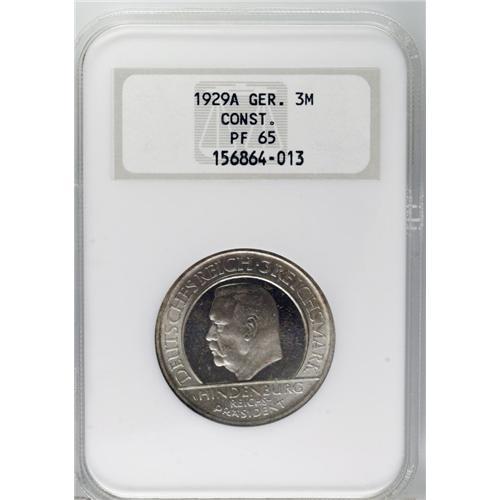 <B>Weimar Republic. 3 Reichsmark 1929-A,</B></I> KM-63 10th anniversary Weimar constitution and portrait of von Hindenburg, PR65 NGC, a most handsome piece with iridescent gold toning.<BR><BR><b>Shipping:</b> Coin/Currency (<a target="_blank" href="http://www.heritageauctions.com/common/shipping.php">view shipping information</a>)