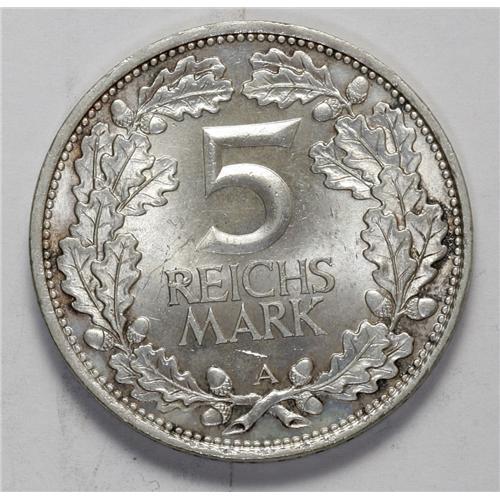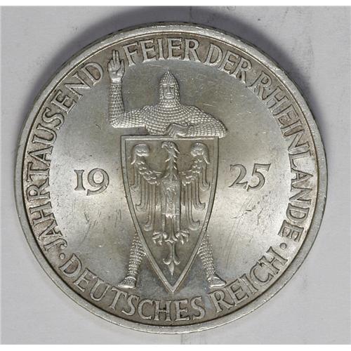 <B>Weimar Republic. 5 Reichsmarks 1925-A,</B></I> KM-47 Rhineland 1000 Years, Choice UNC, beautiful light iridescent silvery toning.<BR><I>From the Monedas Oro Collection</B></I><BR><BR><b>Shipping:</b> Coin/Currency (<a target="_blank" href="http://www.heritageauctions.com/common/shipping.php">view shipping information</a>)