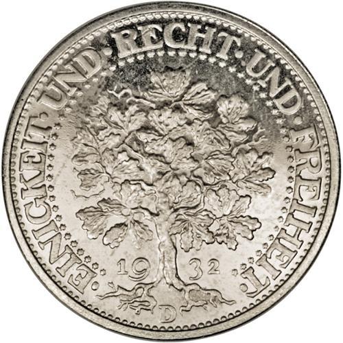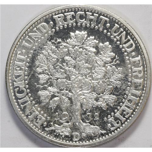 Weimar Republic 5 Reichsmark 1932-D, KM56, choice Proof