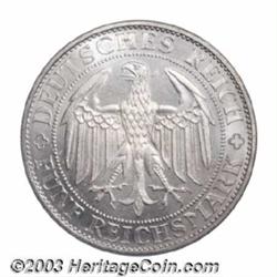<TABLE cellSpacing=0 cellPadding=0 width="100%" bgColor=#000000 border=0><TBODY> <TR><TD width="100%"><TABLE cellSpacing=1 cellPadding=3 width="100%" border=0><TBODY><TR><TD width="100%" bgColor=#79735c><FONT face=arial color=#ffffff size=3><B>Description</B> </FONT></TD></TR><TR><TD width="100%" bgColor=#ffffff><FONT face=arial size=2><B>Weimar Republic. Meissen 5 Mark 1929E,</B></I> KM66, MS64 NGC. Lustrous and Choice. </FONT></TD></TR></TBODY></TABLE></TD></TR></TBODY></TABLE><BR><A name=PricesRealized></A><TABLE cellSpacing=0 cellPadding=0 width="100%" bgColor=#000000 border=0><TBODY><TR><TD width="100%"><TABLE cellSpacing=1 cellPadding=3 width="100%" border=0><TBODY><TR><TD width="100%" bgColor=#79735c><A name=PR><FONT face=arial color=#ffffff size=3><B>Previous Prices from Heritage Auctions</B> </FONT></A></TD></TR><TR><TD bgColor=#f6f6ed>No Prior Data Recorded </TD></TR><TR><TD bgColor=#ffffff><FONT face=arial size=1 ?>PLEASE NOTE: All prices realized reflect the final hammer price PLUS the buyer's premium in auctions that charge a buyer's premium. Each item has a notation at the top of the listing indicating whether that lot included a buyer's premium. Example: A item that sells with a final hammer price of $100 and a 20% buyer's premium will display with a price realized of $120. All information listed is intended to be as accurate as possible, but errors are possible. Please use this guide carefully and inform us of any inaccuracies. </FONT></TD></TR></TBODY></TABLE></TD></TR></TBODY></TABLE><BR><TABLE cellSpacing=0 cellPadding=0 width="100%" bgColor=#000000 border=0><TBODY><TR><TD width="100%"><TABLE cellSpacing=1 cellPadding=3 width="100%" border=0><TBODY><TR><TD width="100%" bgColor=#79735c colSpan=6><FONT face=arial color=#ffffff size=3><B>Price Guide*</B> </FONT></TD></TR><TR bgColor=#f6f6ed><TD align=middle><B>Grade</B> </TD><TD align=middle><B>Coin World<BR>(Trends)</B> </TD><TD align=middle><B>Numismedia<BR>Retail</B> </TD><TD align=middle><B>Numismedia<BR>Wholesale</B> </TD><TD align=middle><B>Coin<BR>Universe</B> </TD><TD align=middle><B>Heritage<BR>Value Index</B> </TD></TR><TR bgColor=#ffffff><TD colSpan=6><FONT size=1>*All information listed is intended to be as accurate as possible, but errors are possible. No item may be returned or refused based on this information which is provided as a service to our customers. You should contact each pricing source directly to determine the accuracy of this information. </FONT></TD></TR></TBODY></TABLE></TD></TR></TBODY></TABLE><BR><TABLE cellSpacing=0 cellPadding=0 width="100%" bgColor=#000000 border=0><TBODY><TR><TD width="100%"><TABLE cellSpacing=1 cellPadding=3 width="100%" border=0><TBODY><TR><TD width="100%" bgColor=#79735c><FONT face=arial color=#ffffff size=3><B>Population Guide</B> </FONT></TD></TR><TR bgColor=#ffffff> Important notice: Heritage usually auctions material at the rate of 200-250 lots per hour. On some occasions eBay Live bid software or the Internet may not be able to keep up with the pace of the auction. We recommend placing a realistic absentee bid now as insurance to avoid disappointment. Occasionally the auctioneer may eliminate or reject an eBay Live bid, and the auctioneer may also reopen a lot after the close of the eBay live bidding (usually because we missed an audience bid), and may reject your bid even if it shows you as the winning bidder. By bidding via eBay Live, you agree that Heritage may award the lot to another bidder at its sole discretion under the circumstances described above or any other reasonable circumstances. Also please note that all Heritage lots purchased through eBay Live carry a 20% Buyer's Premium. Please make sure you read the Terms and Conditions before you bid.</TD></TR></TBODY></TABLE></TD></TR></TBODY></TABLE>