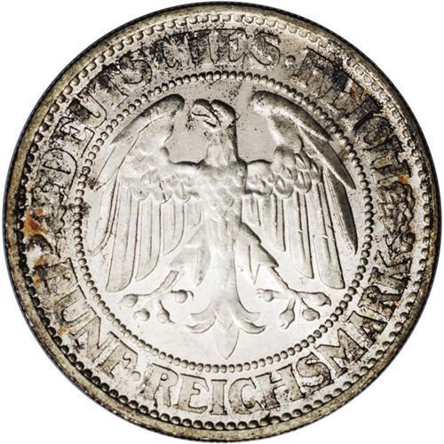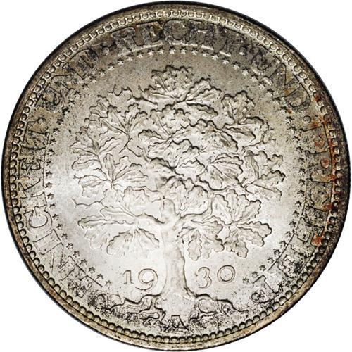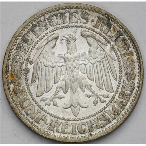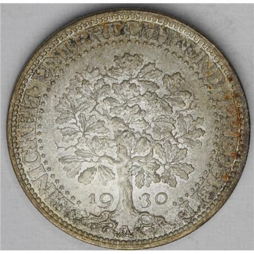 <B>Weimar Republic. Oak Tree 5 Marks 1930A, </B></I>KM56, Choice Uncirculated with some dark speckles atop a light silver and gold base.
